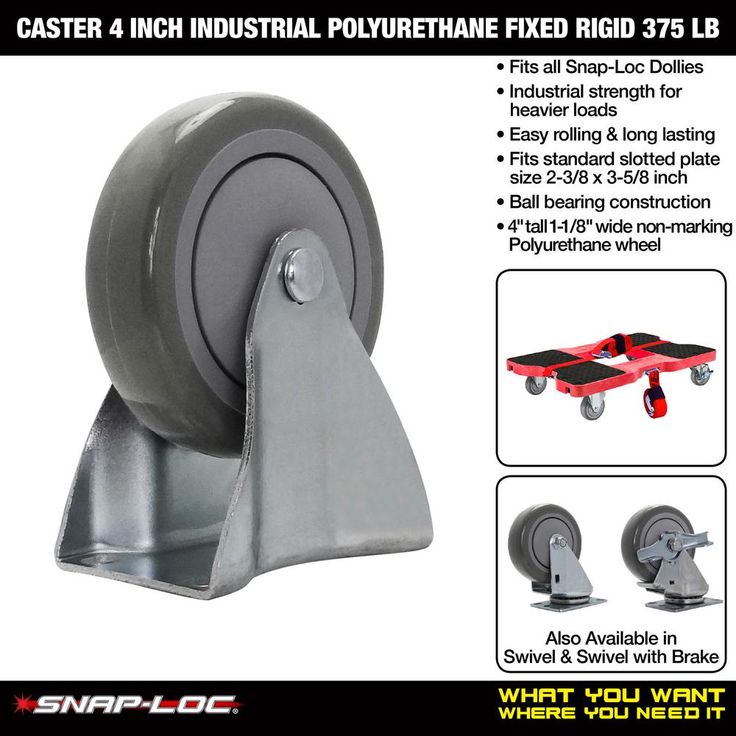 Easiest rolling, heavy-duty, 375 lb. capacity 4 in. fixed caster with standard size 2-3/8 in. x 3-5/8 in. slotted plate. This caster features ball bearing construction, non-marking sold polyurethane wheels, a 1-1/8 in. W tread, and an overall caster height of 5 in. It is the perfect replacement caster for any standard wood dolly and especially the SNAP-LOC Dolly.