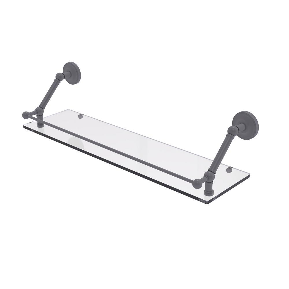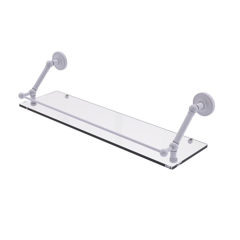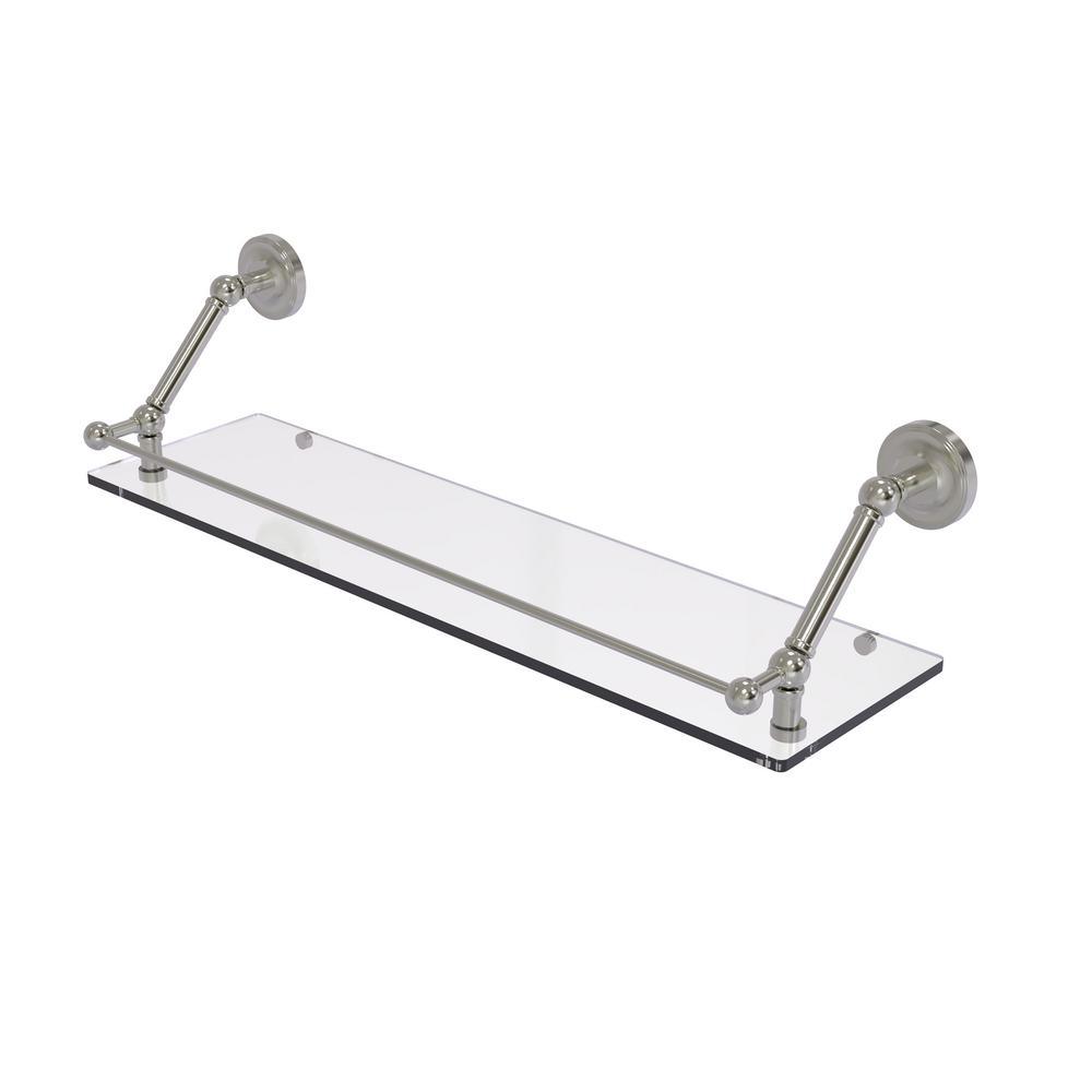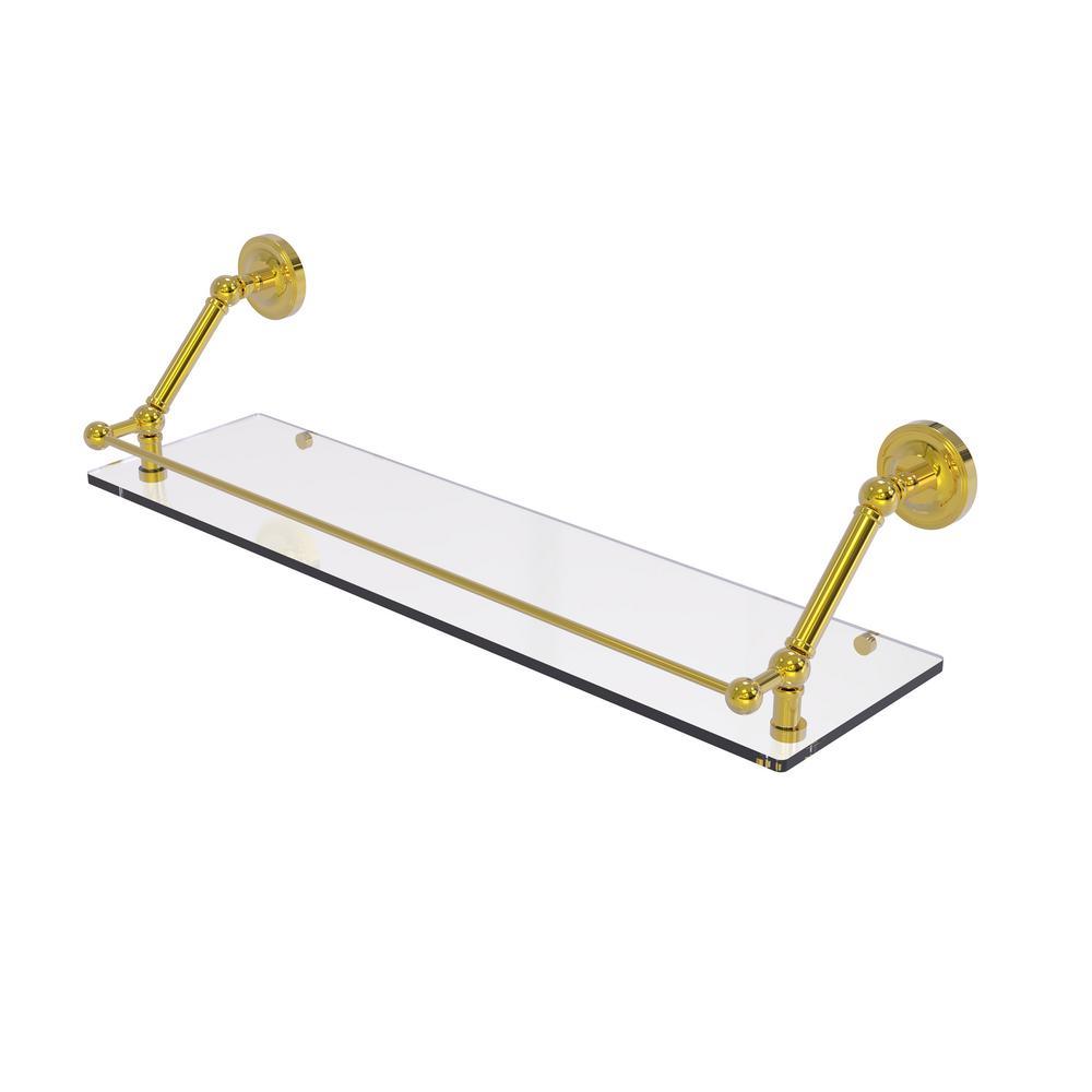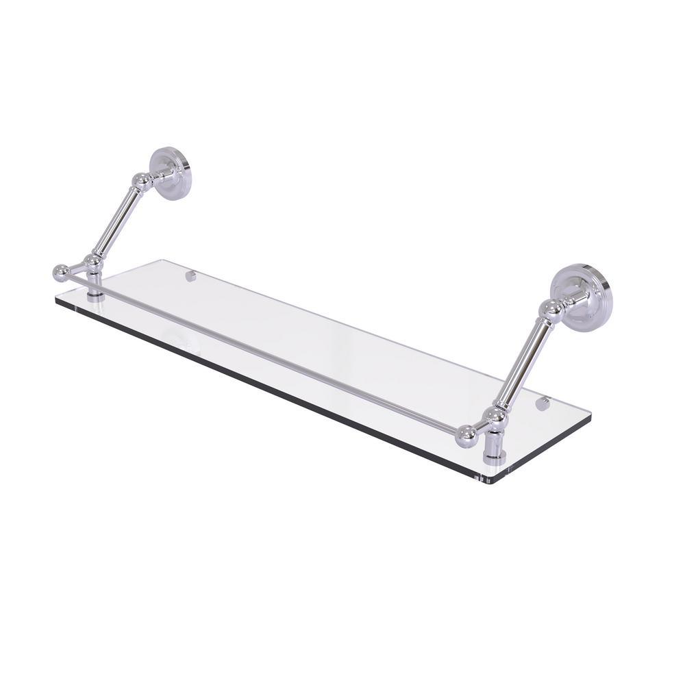 A floating shelf delivers a unique look to any bathroom or powder room. Unlike other shelves, the surface of our floating shelf is suspended below the arms instead of propped up by the brackets. This makes the shelf look like its floating in mid-air. The gallery rail on this shelf will keep your items and secure and in place. Our floating glass shelf features solid brass arms that reach down to the glass surface. Shelf also uses solid brass supports under the back edge of the glass for additional strength and support.