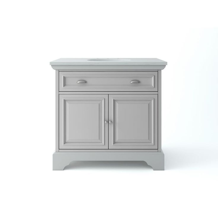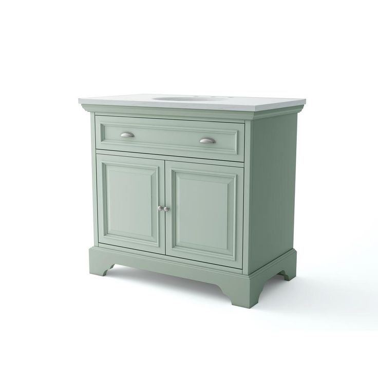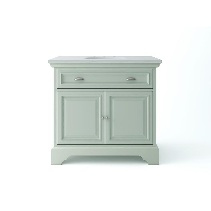 Our Sadie Single Vanity will usher cool, vintage style into your bath. The recessed panels of the faux drawer and working cabinet doors are trimmed with molding. The white marble top is the perfect complement to the antique blue finish. Crafted of natural marble, the top of this bathroom vanity cabinet may contain swirling or veining. These features are part of the natural beauty of stone and have no effect on function or durability.