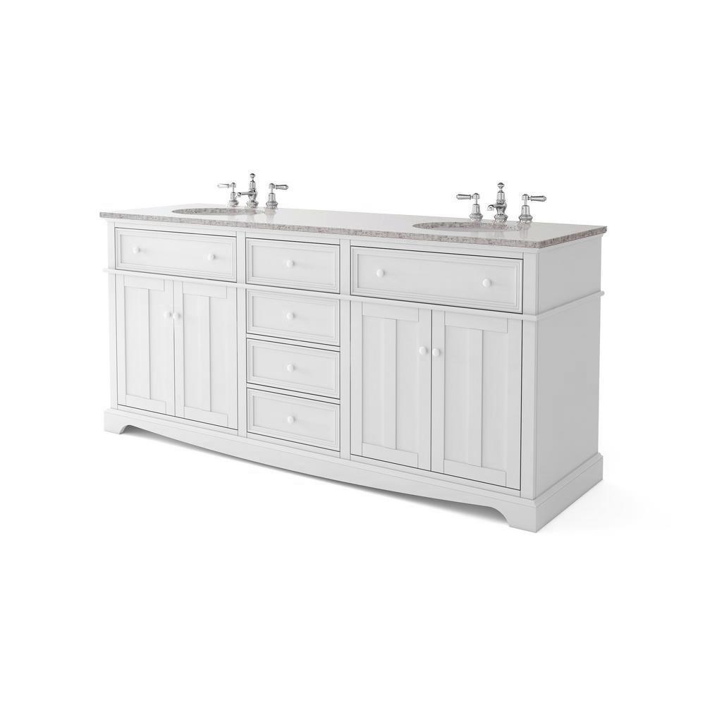 With 4 drawers and 2 under-sink cabinets, our Fremont Double Vanity offers plenty of morning prep space for 2. Each drawer is framed in slim, elegant molding. Crown and foot molding sets off the double recessed panels of each door. A gently curved toe kick runs the length of the bath vanity. This fresh, transitional design is capped off by a real granite top. The top may contain swirling or veining, features that are part of the natural beauty of stone and have no effect on function or durability.