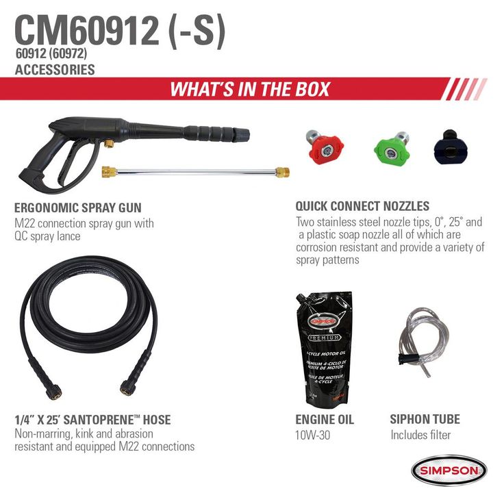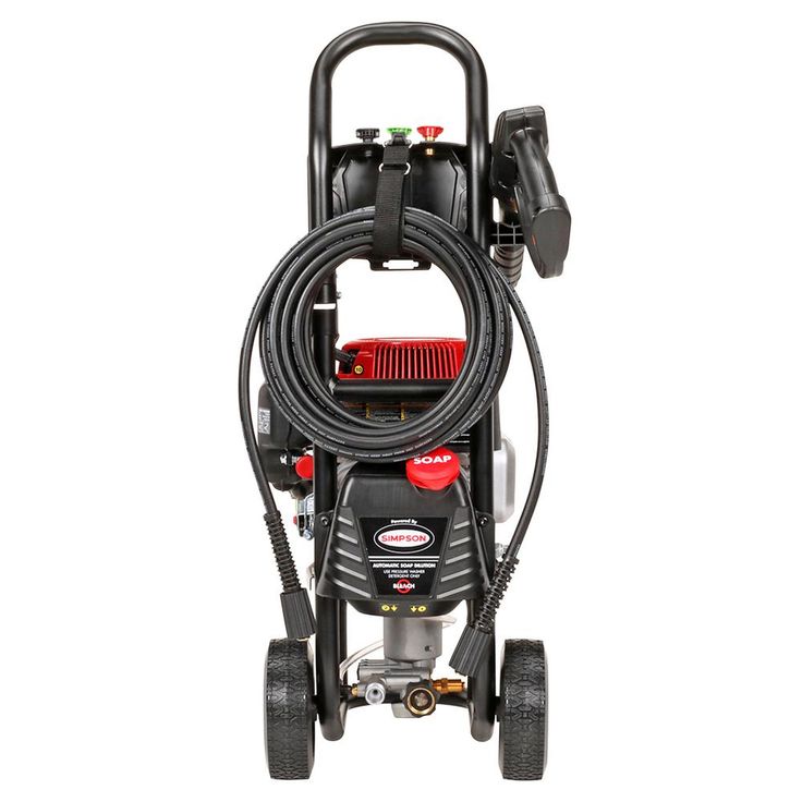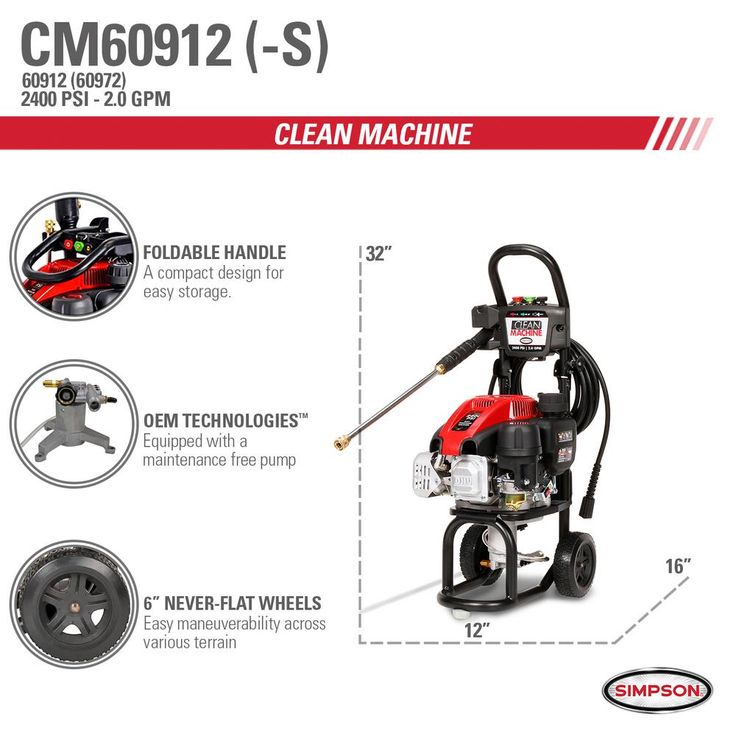Clean big with the Clean Machine by SIMPSON! This fully assembled compact gas pressure washer is lightweight, easy to store and provides a powerful pressure washing experience. Just setup and you are ready to clean. The Clean Machine features a 149cc SIMPSON OHV engine paired with an OEM Technologies axial cam pump. The fully assembled pressure washer steel frame is powder coated for corrosion resistance and features a fold down handle that allows for quick & convenient storage, taking up minimal storage in tight spaces. Wheels that will never go flat provide an added benefit for maneuverability. This compact gas pressure washer will allow easy access into hard to clean areas.