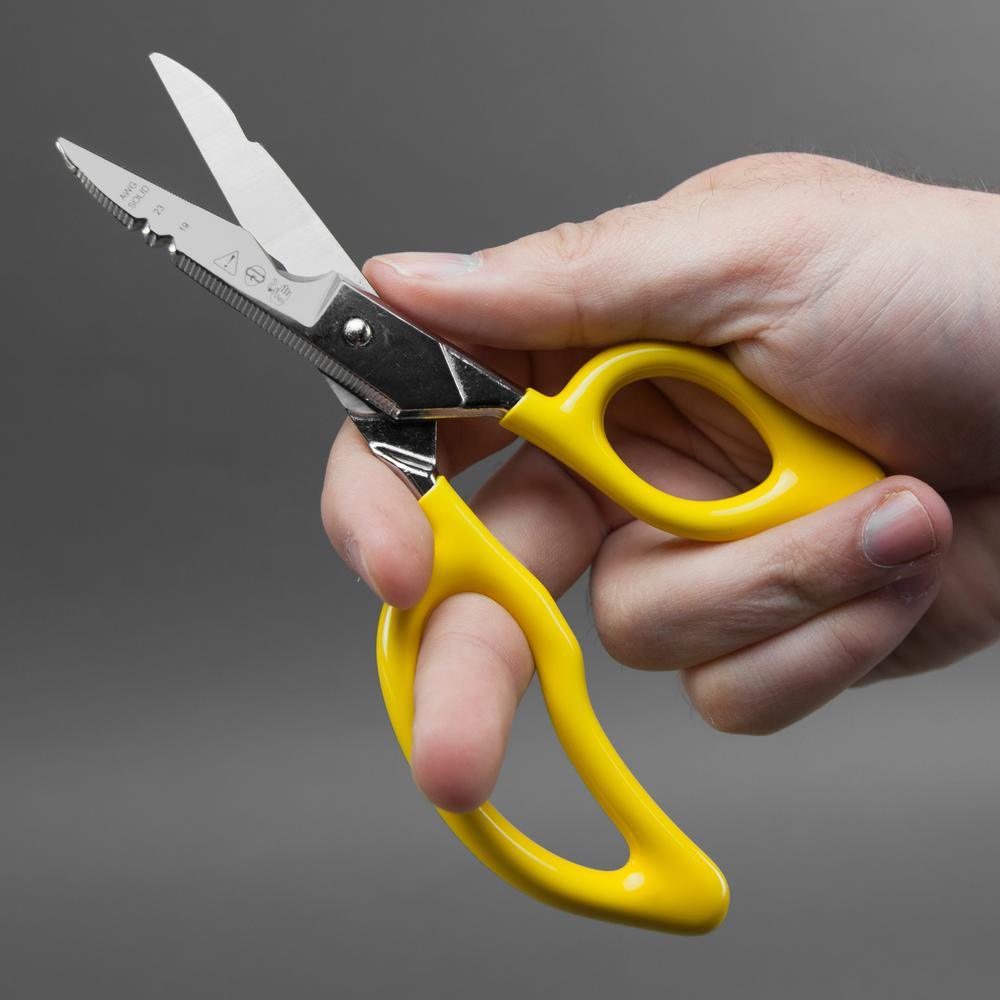 Cut, strip and deburr with the All-Purpose Electrician Scissors. The durable, forged high carbon steel blades maintain sharpness and outlast stamped designs. This versatile tool features a cable cutting notch for up to 14 AWG wire, stripping notches for 19 and 23 AWG wire plus a notch in the tip to de-burr electrical boxes. The unique, dipped handle design allows for multiple hold preferences.
