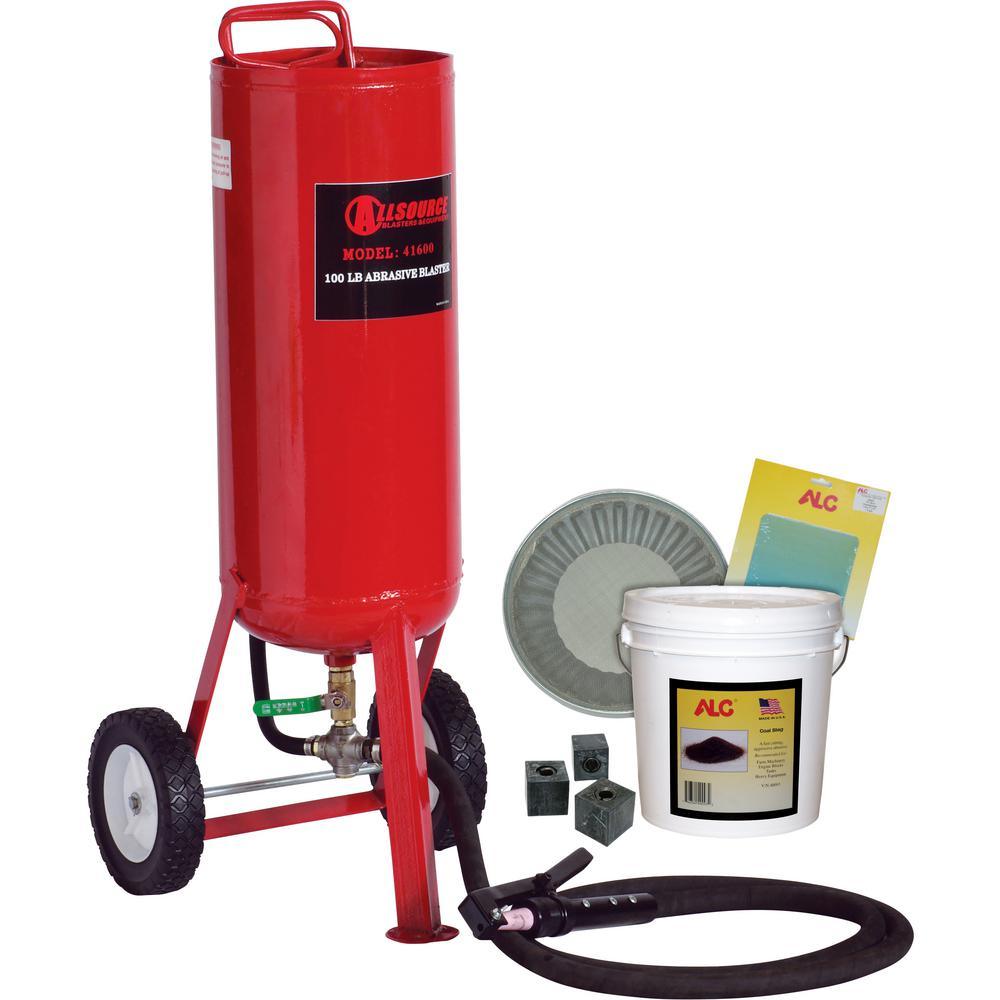 This ALC abrasive pressure blaster is perfect for a wide variety of surface preparation jobs such as removing paint, scale, rust and oxidation. Features an 8 ft. blast hose, durable wheels and built-in handle to allow for easy transport and a heavy-duty steel dead man shutoff handle for longevity and safety. Includes everything you need to start your blasting project today: 25 lbs. of coal slag abrasive, standard blast hood with 5 in. x 6 in. lens, 5 extra hood lenses, an abrasive strainer, 5 extra sealing blocks and (1) 1/8 in. and (1) 3/32 in. nozzle. Simply fill with abrasive and connect to an air compressor.