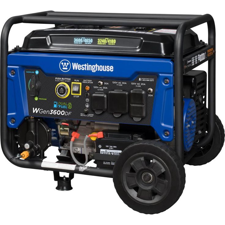 The powerful WGen3600DF engineered by Westinghouse is a portable generator to provide you with dependable power when you need it the most, whether you're at home or on the go. With dual fuel ability, this generator offers versatility by running on either gas or propane (LPG). It produces up to 4,650 peak watts and 3,600 running watts when utilizing gasoline and runs for up to 13.5 hours on a 4 gal. (15 L) gas tank with a built-in fuel gauge. Constructed with a 212cc Westinghouse OHV Engine, the WGen3600DF is made with a cast iron sleeve to provide engine durability while safety features like automatic low oil shutdown, overload protection, and GFCI outlets ensure longevity. Equipped with an RV Ready TT-30R 30A outlet that conveniently hooks to your travel trailer, the WGen3600DF keeps the air conditioner and any travel necessities you may have up and running all day long. It showcases Push-Button Electric Start that pairs with a wireless remote key fob for effortless ignition and is designed with an extendable handle and rugged never-flat wheels to make portability easy. The WGen3600DF is complete with a 3-Year Warranty and Lifetime Technical Support backed by our nationwide customer service and support network.