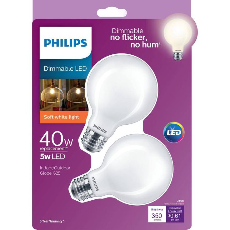 This 40-Watt equivalent G25 frosted globe LED bulb uses only 5-Watt of energy. Use as a replacement for your incandescent G25 bulbs in vanities, table lamps and other visible fixtures. The long lasting LED bulb is ideal for use in areas that are difficult to reach. The frosted appearance provides a soft white, diffused light.