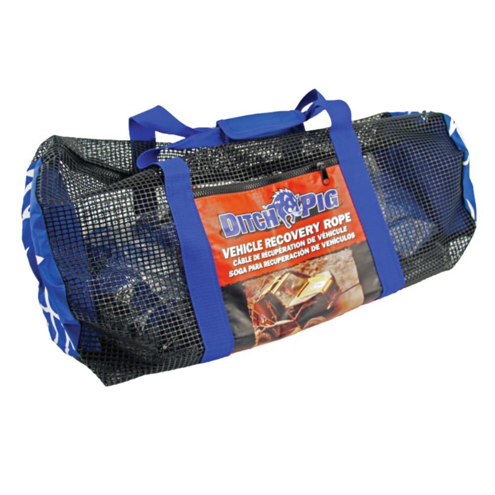 DitchPig Kinetic Energy Recovery Ropes are the safest and easiest way to get a vehicle unstuck from mud, sand or snow. Used for dynamic vehicle recoveries when your vehicle is working, but you simply cant get unstuck. Recovery Rope is made from 100% high-tenacity double braid Nylon rope, which naturally stretches up to 30% of its original length. As the rope stretches, it builds up kinetic energy, like a rubber band. Once the rope reaches maximum stretch, it starts to return to its original length. It literally works like a slingshot. Its simple and brilliant. Kinetic Energy Recovery Ropes are the safest and easiest vehicle recovery tool - perfect for recreational off-roading, everyday cars, construction and commercial vehicles and farming machinery. 1-1/2 in., size has a Minimum Breaking Strength (MBS) of 64,300 lbs., making it ideal for Tow Trucks, Dump Trucks, Large Commercial Trucks, XL Row Crop Tractors and Combines. 1-1/2 in. rope comes with a robust and durable duffel bag, which features mesh netting. Because water reduces Nylons strength by up to 15%, you want to keep your DitchPig rope clean and dry when not in use. The mesh netting allows your wet recovery rope to drain and dry quickly, bringing the rope back to full strength. DitchPig Don't Get Stuck Without It.