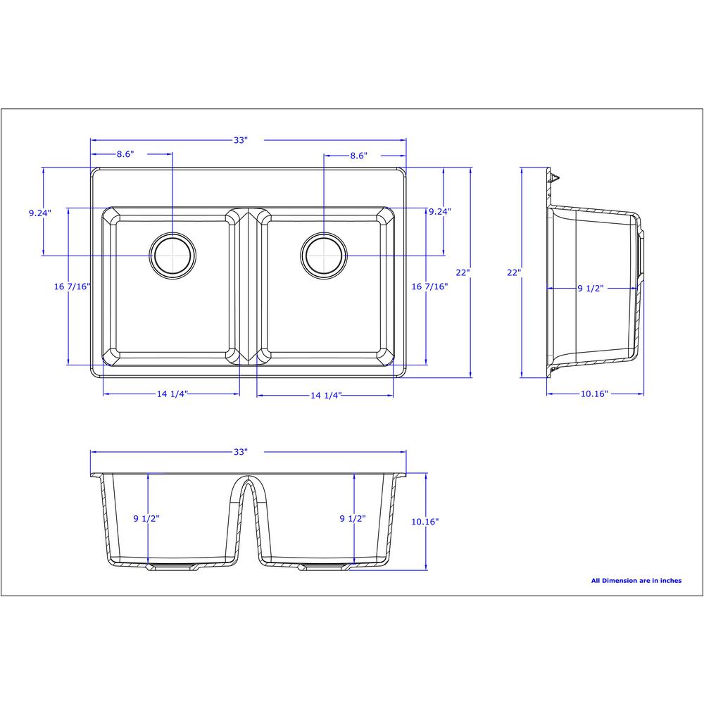 • Sink dimension: 33 in. L x 22 in. W x 9.5 in. D