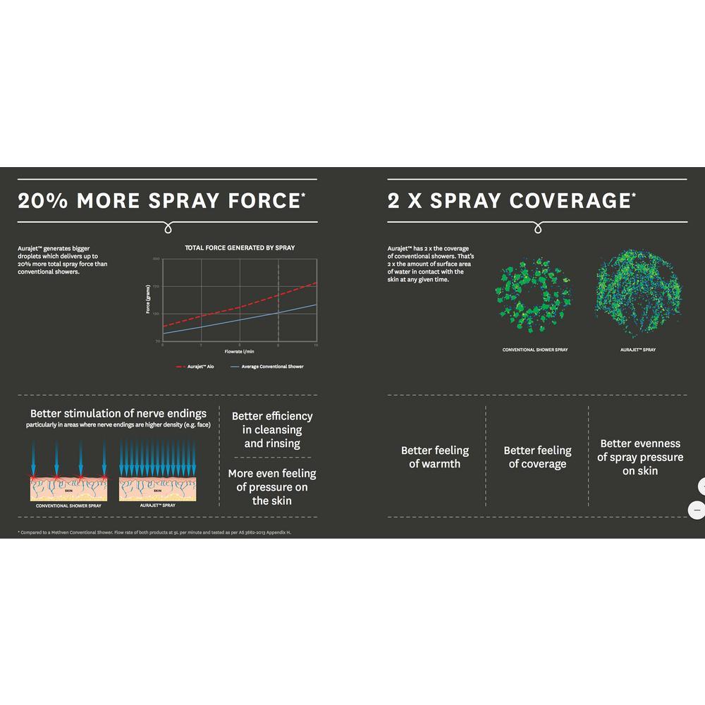 Water flow rate 1.8 gallons per minute in combination with Aurajet patented technology providing power shower experience using 28% less water than US industry standard conventional showers