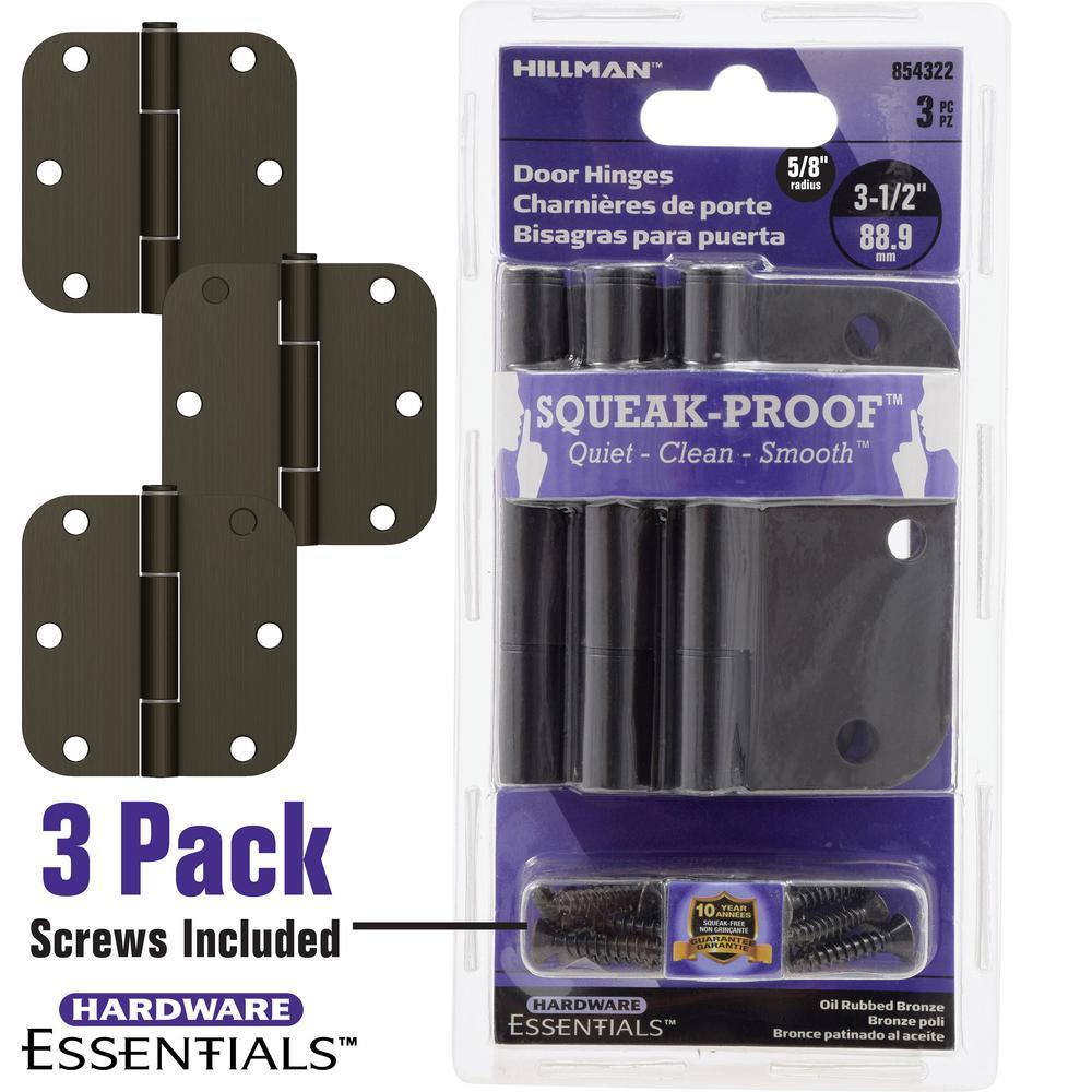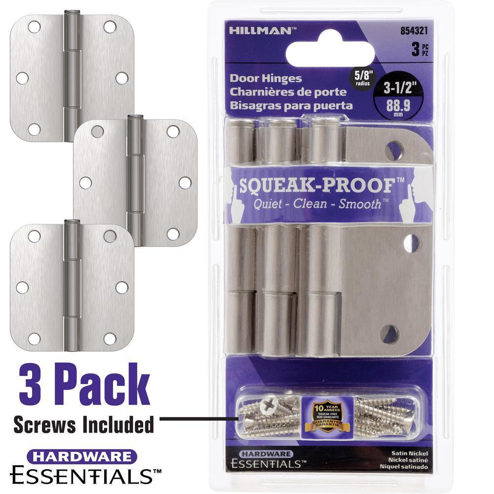 This 3-pack of 5/8 in. Satin Nickel Squeak Proof Hinges offers quiet, creak-free performance and a sleek satin nickel finish. The full mortise configuration ensures a secure and neat fit, while the removable pins, screws, and instructions make installation quick and hassle-free. Designed for 1-3/8-in. thick doors, these 3-1/2 in. hinges are compatible with standard residential door hardware. Elevate your room or storage doors with this essential Hillman Hardware product.