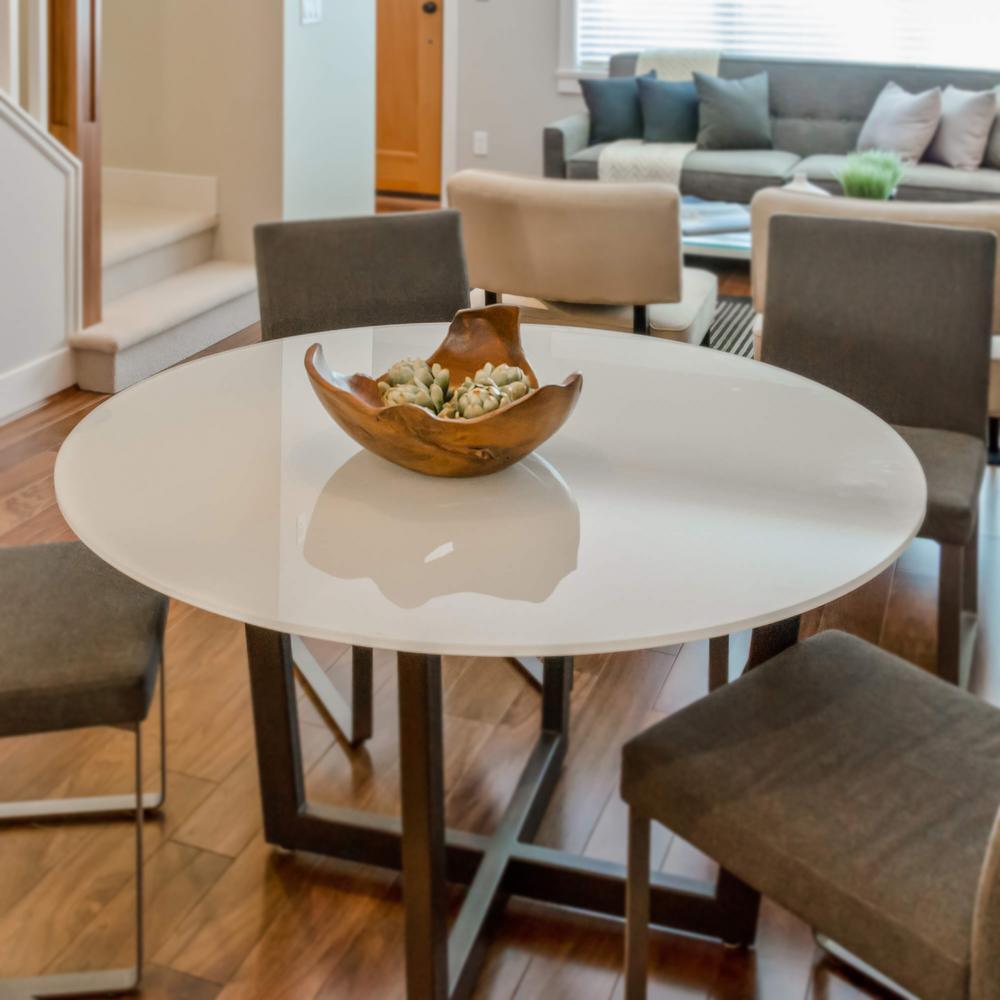 30" Inch round extra white colored glass table top can be used as a table top to protect a desk, patio table, surface of an existing table, coffee table and bedside table. It's a white back-painted Low Iron Glass with extra bright. Available Sizes: 20, 22, 24, 26, 28, 30, 32, 34, 36, 38, 40. Available Colors: Red, Green, Blue, Black, and White. Tempered / Annealed: Tempered (toughened through a process of extreme heating and rapid cooling during the manufacturing process) glass is two or more times stronger than annealed glass. When broken, it shatters into many small fragments which prevent major injuries. Annealing is a process of slowly cooling glass to relieve internal stresses after it was formed. The process may be carried out in a temperature-controlled kiln. Glass which has not been annealed could be exposed to crack or shatter when subjected to a temperature change or mechanical shock. Annealing glass is important in order to make it more durable. This glass table is available in the Flat polish finish, it is the standard edge produced by a straight line rectilinear or CNC machine and produces a fine polished flat edge suitable for all furniture glass and frameless toughened panels. Recommendation: Clear rubber bumper pads protect and cushion your glass top surfaces. Rubber bumper especially uses vacuum power to improve the pressure bearing capacity of the glass tabletop.
