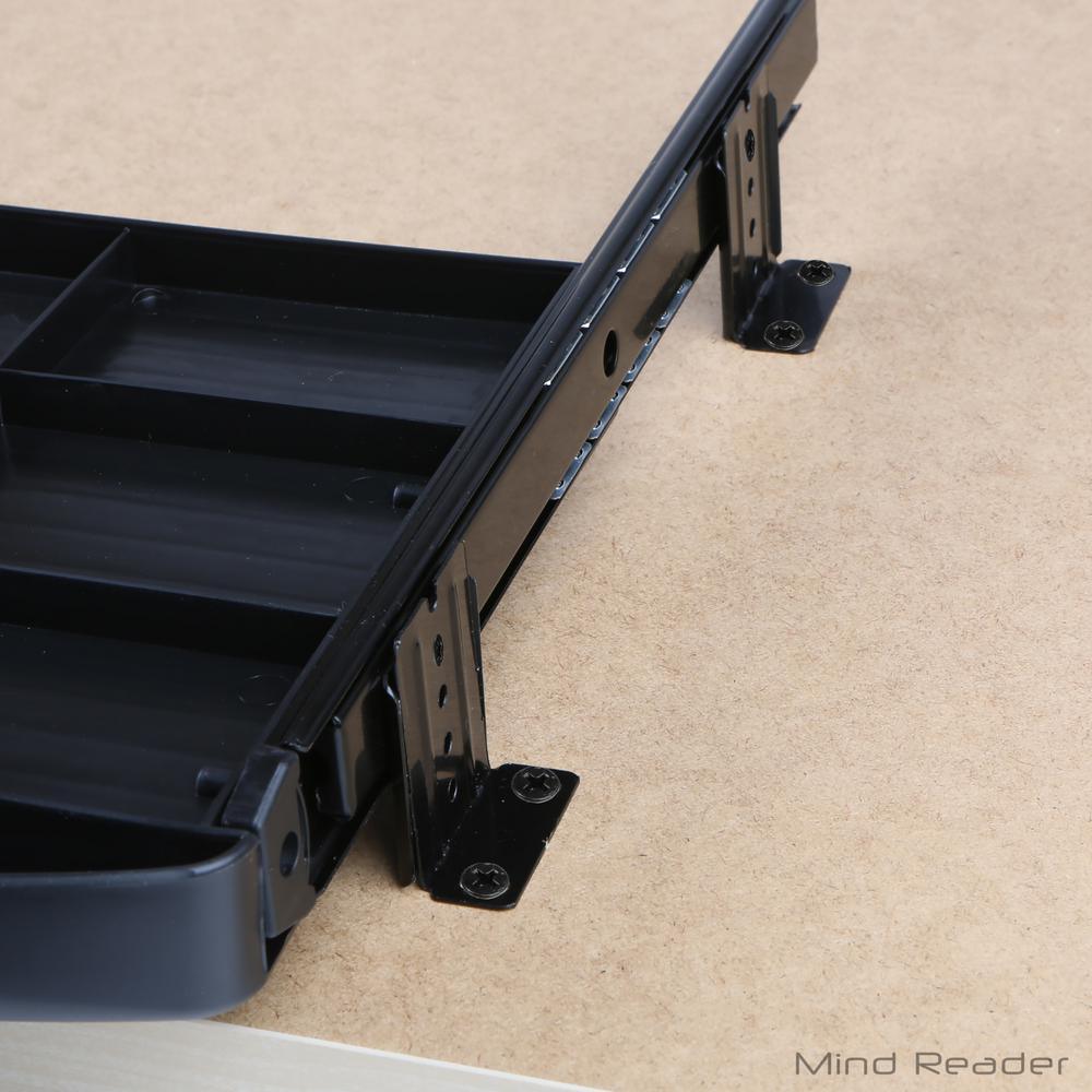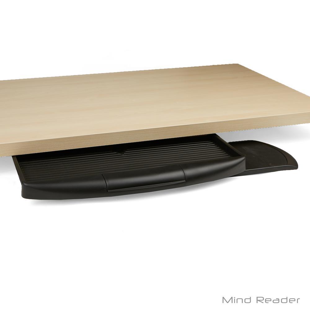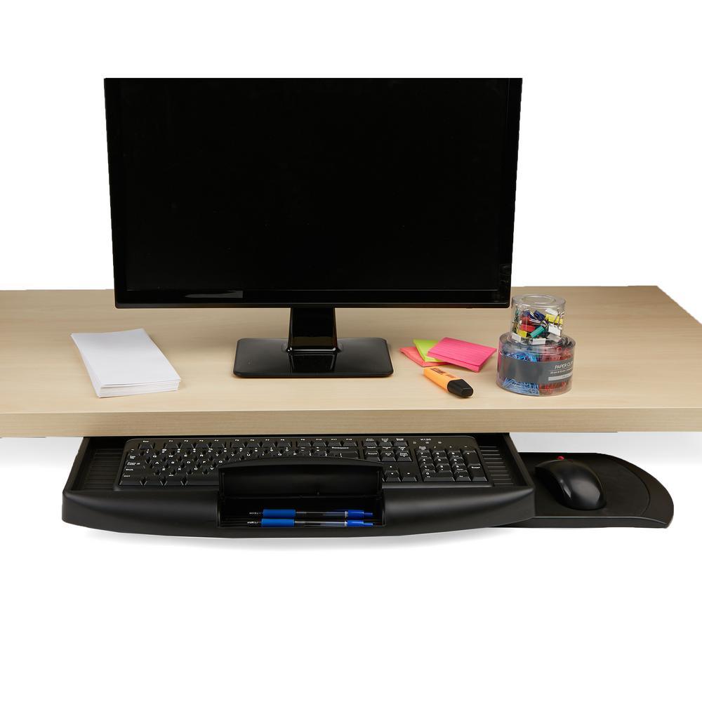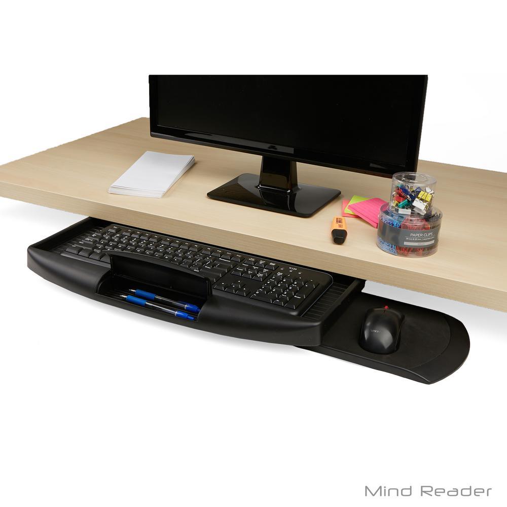 Keep your keyboard off your desk and allow more shelf space for other necessities. This sliding drawer for your keyboard will allow you to put it away when needed and just pull it out when you are back on the computer. It even has a compartment for your pens and pencils if you're doing work at your computer.