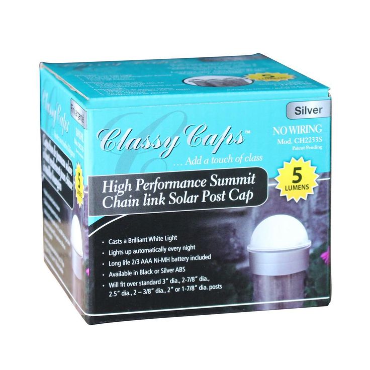 Add a touch of class to your chain link fence with our high performance Summit solar post cap. This one of a kind design by Classy Caps will compliment your existing chain link posts. Turns on automatically every night casting a brilliant white light onto the surrounding area. Manufactured to fit over six standard chain link fence posts - 3” dia., 2-7/8” dia., 2.5” dia., 2 – 3/8” dia., 2” or 1-7/8” dia.