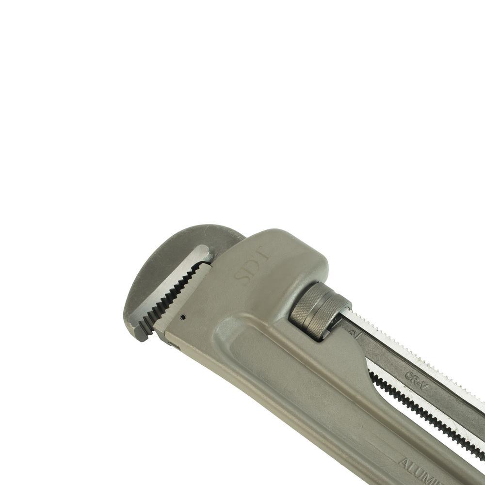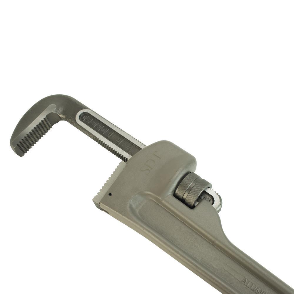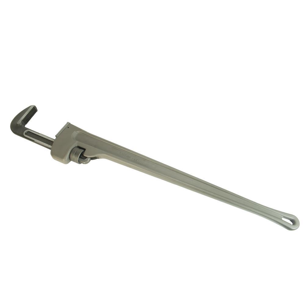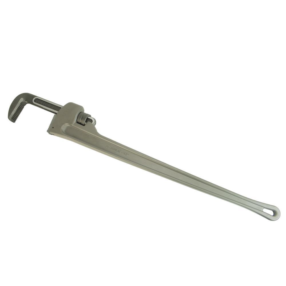 Steel Dragon Tools 48 in. Aluminum Straight Pipe Wrench 31115 features heavy-duty construction and a sturdy, aluminum I-beam frame. The I-beam frame helps keep the tool from weighing down the operators hand without sacrificing overall durability. Aluminum construction is nearly 40% lighter than comparable cast-iron wrenches. Self-cleaning threads with replaceable heel jaw will help the wrench operating for years to come. This wrench is ideal for use on 4 in. to 5-1/2 in. pipe with a maximum 6 in. pipe capacity. Wrench features replaceable hook and heel alloy steel jaws.