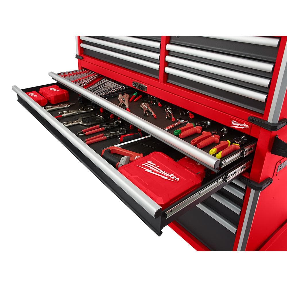 Q: Does it include drawer liners and a top mat? A: Yes, pre-cut PVC drawer liners and a thick Milwaukee-embossed top mat are included.