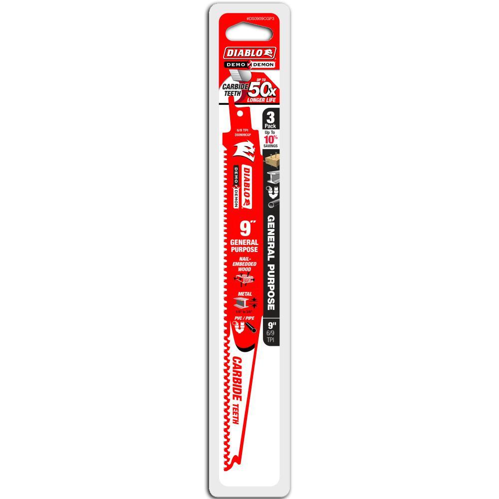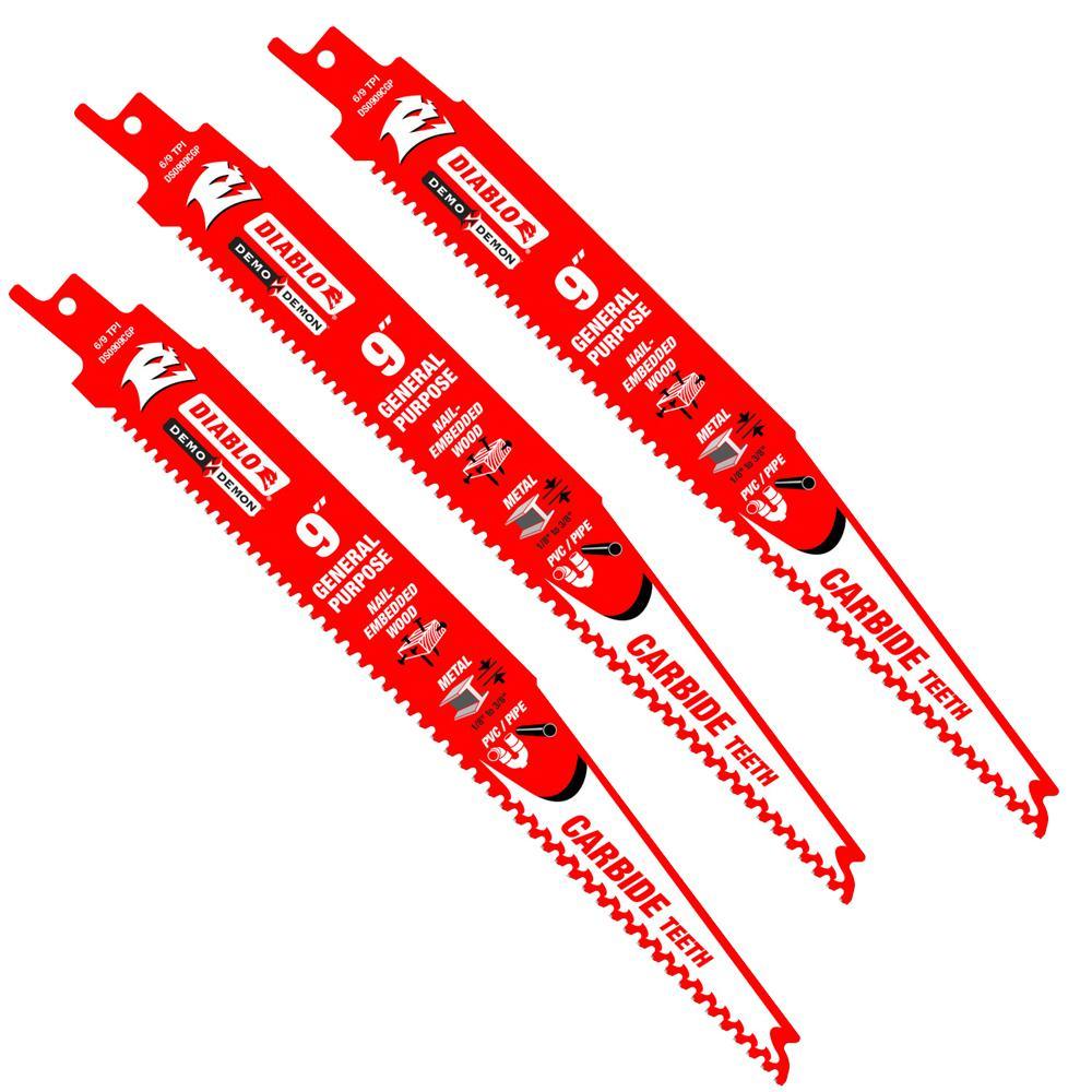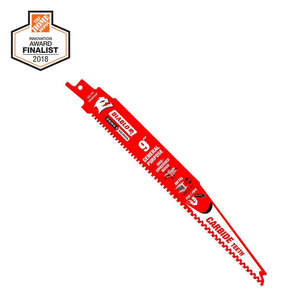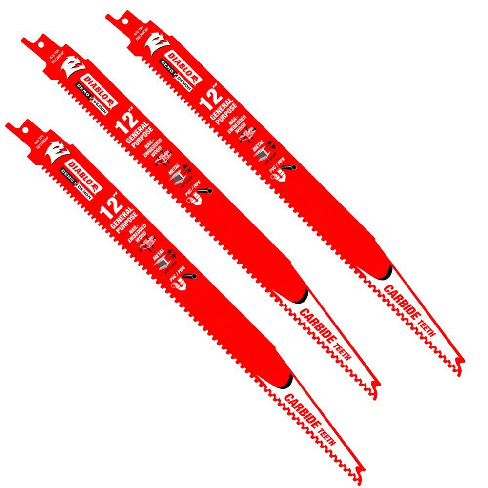 Diablo new Demo Demon carbide general purpose reciprocating blades are the first on the market specifically designed for both wood and metal. These blades include exclusive features that deliver unmatched 50 times longer life in both wood and metal cutting applications. With an oversized blade body, variable tooth design and PARMA-SHIELD non-stick coating, this blade is ideal for cutting nail-embedded wood and ferrous metal applications with a 3/32 in. to 1/4 in. T.