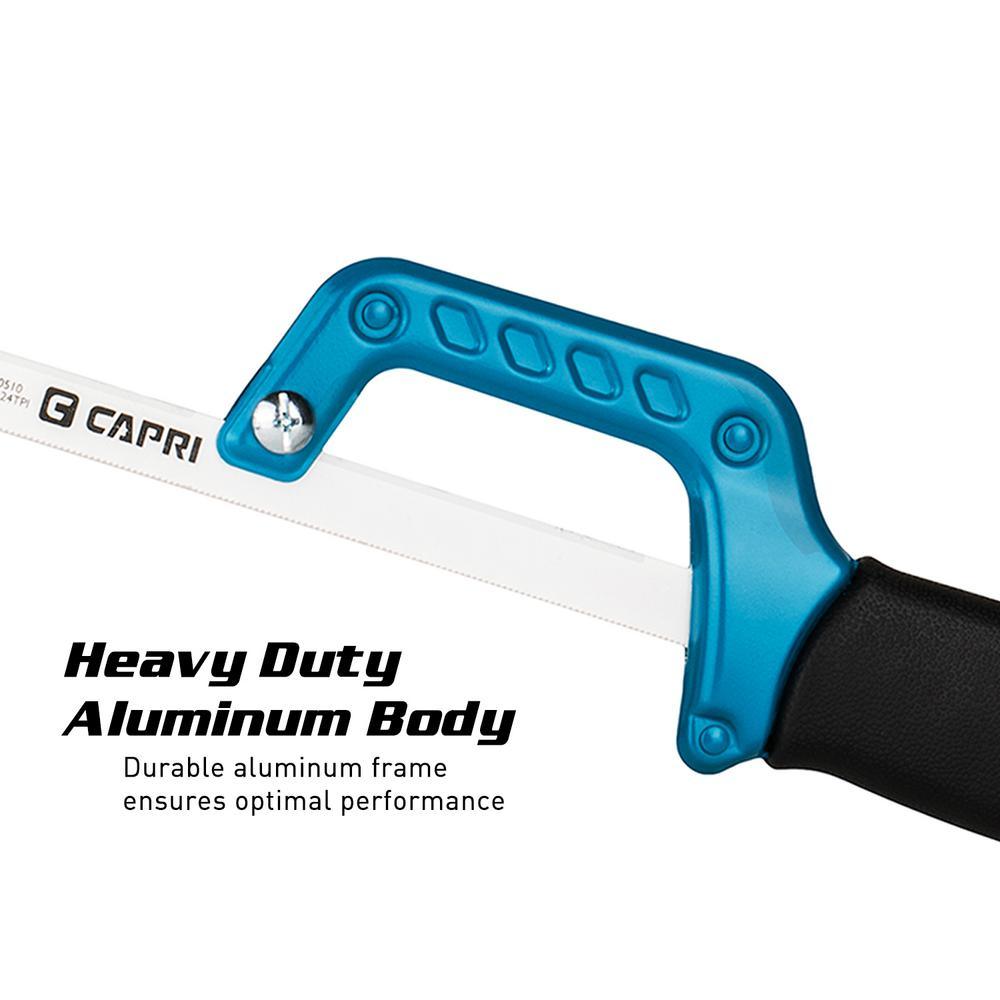 The Capri Tools 12 in. Mini Hacksaw features a compact design and is ideal for cutting in tight spaces. Patented design lets you install standard 10 or 12 in. saw blades. The mini hacksaw features an ergonomic soft handle that is easy to hold and gives you the extra torque and control you need for the job at hand. A heavy duty bi-metal 12 in. x 24 TPI saw blade is included.