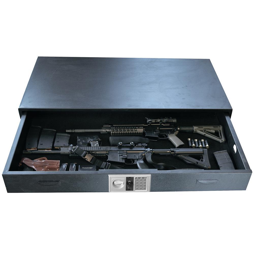 Keep your gun collection hidden and protected with the BUFFALO Under Bed Gun Safe. Standing just 7 in. high with 3 cu. ft. of storage space, the Under Bed Safe will keep firearms and valuables out of sight, but close at hand. The large, felt lined pull-out drawer can hold up to 100 lbs. The Under Bed Safe has a digital lock with a keypad you can program for quick and easy access, but with a key back-up just in case. This Gun Safe also features a pry resistant steel door and 14-Gauge (2 mm thick) steel body.
