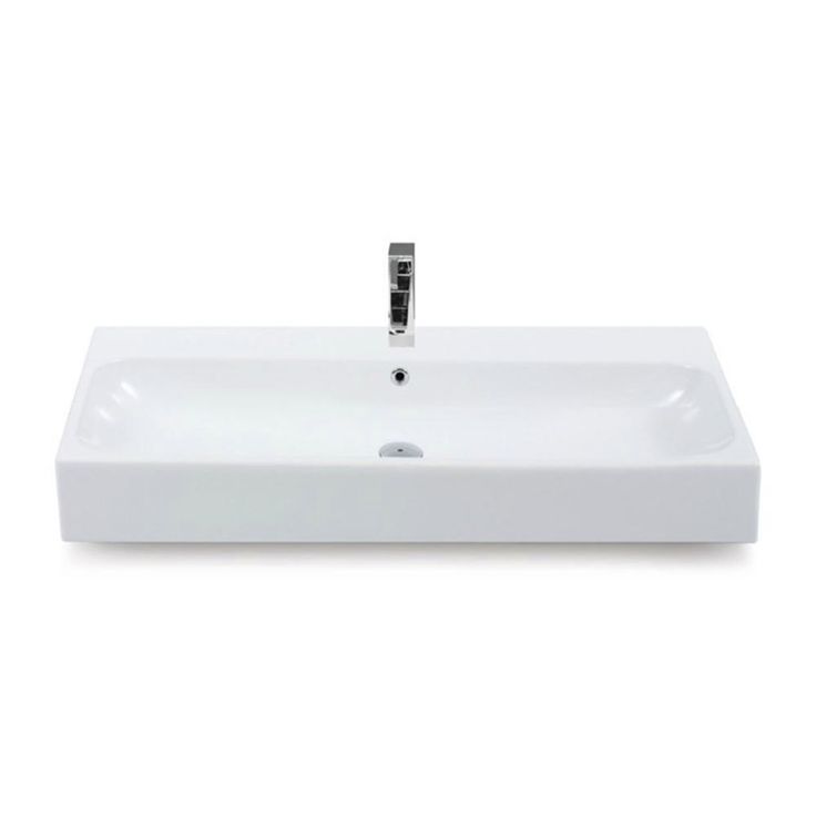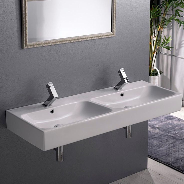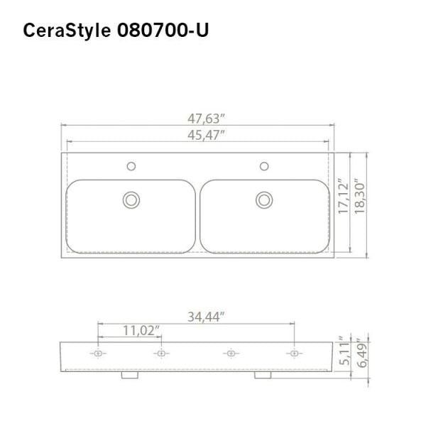 This modern 48 in. wall mounted or vessel bathroom sink features 2 basins and 2 faucet holes. Each sink includes an overflow. This beautiful sink is made out of high quality ceramic, and designed by high-end, and well known Turkish brand CeraStyle.