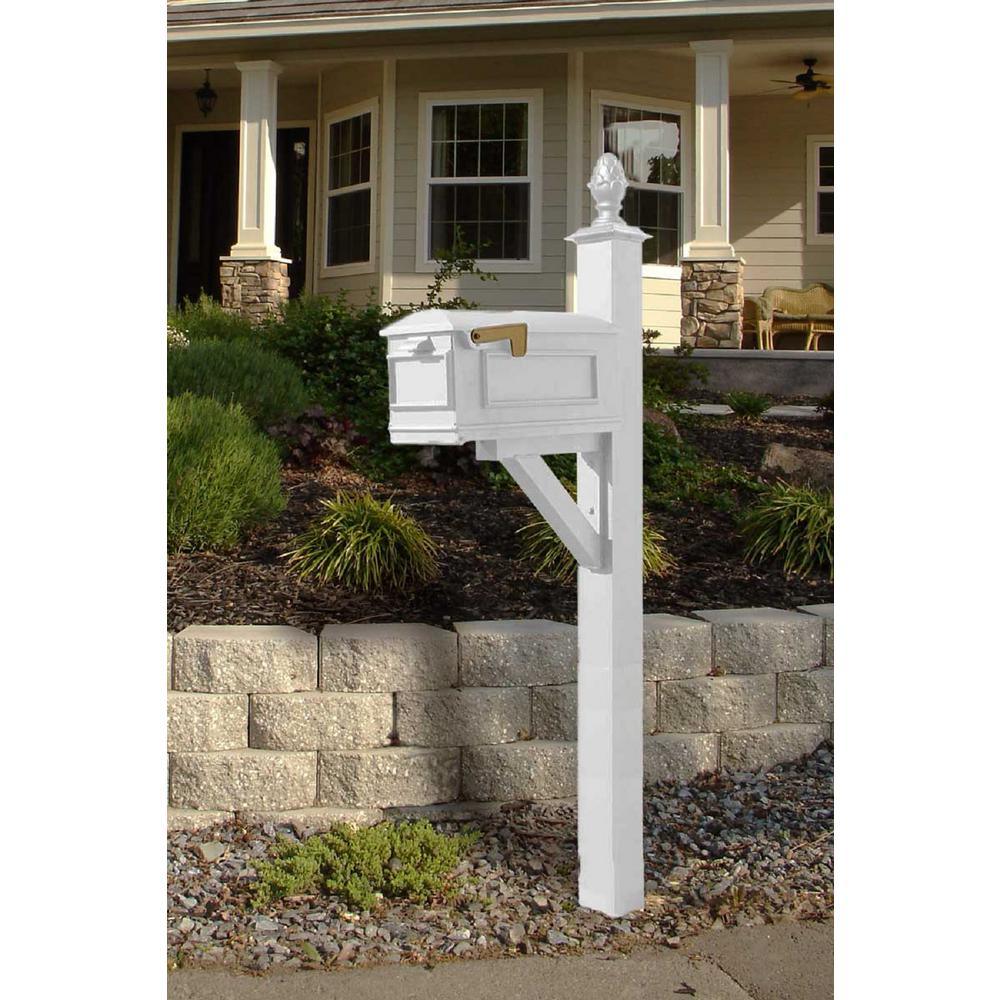 Make a strong statement with our Westhaven post-and-beam style 4 in. x 4 in. aluminum square Mailbox post systems. Mailbox post system features a durable, low maintenance white powder coat finish that will look great for years and comes with a Lewiston Cast Aluminum Mailbox, support bracket and decorative pineapple finial. Lewiston Mailbox is non-locking and is made of cast aluminum with a matching powder coated finish. Post mounts directly into ground, system color is White.