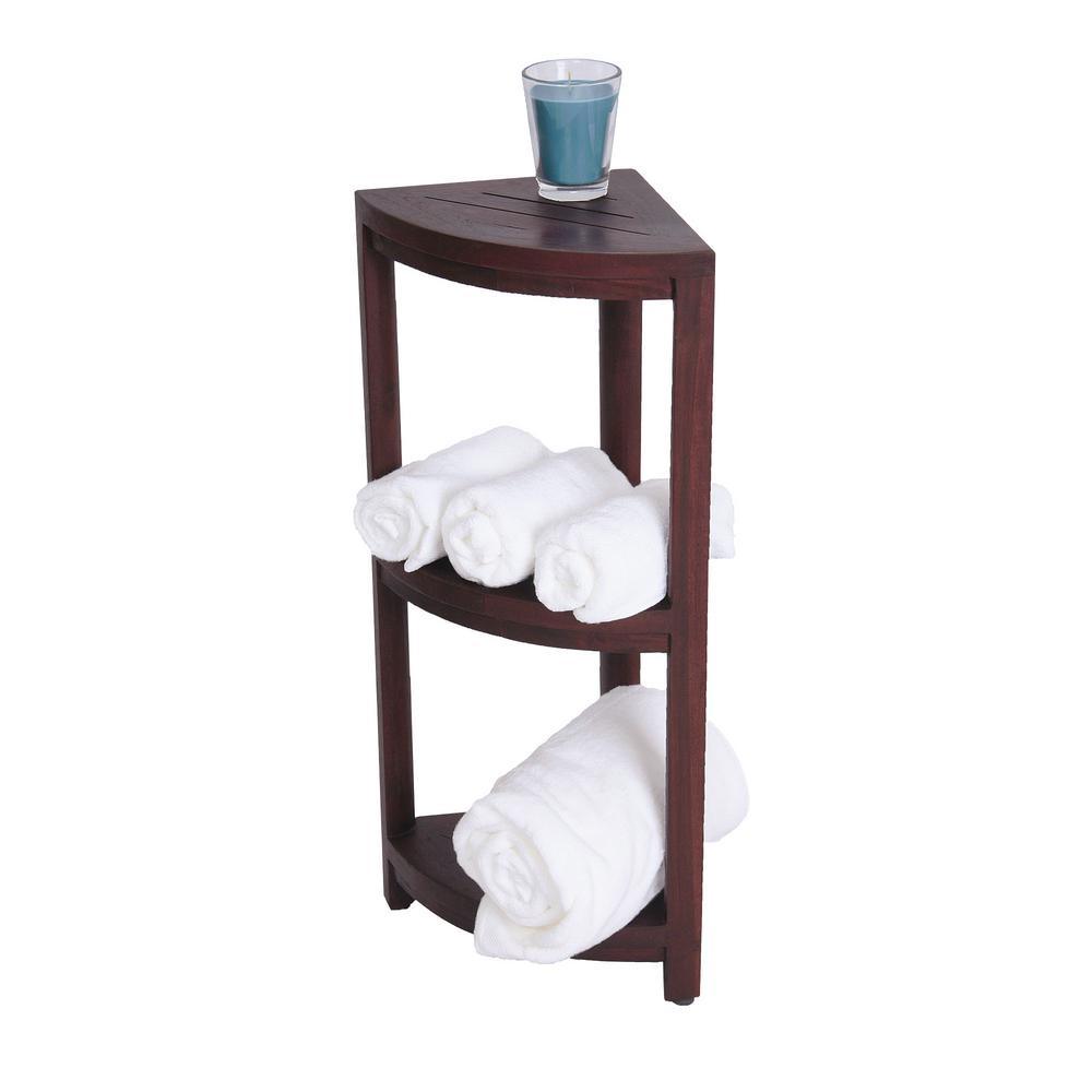 FULLY ASSEMBLED. No hassle, no stress, simply take this corner 3-tier shelf out of the box and place in the corner of your shower, bathroom, deck, or kitchen. 12 in. L x 12 in. W, x 33 in. H the shelves provide room for storing your essentials without taking up a lot of space. The corner design is the most effective utilization of small spaces. In addition to the shower this is great for small urban apartments and homes. Place this in any unused corner to create extra storage or display space. The DecoTeak 3-tier corner shelf is compact enough that it can be placed in the corner of your shower. The foot leveling pads allow you to assure a level surface for sloped shower floor. They also raise the wood off the floor so the legs are not sitting in standing water in between uses. Teak is the wood of choice for moist environments since it is naturally water, mold, and mildew resistant due to its natural density and high oil content. This natural resistance has been supplemented by using our proprietary stain which is a deep penetrating stain with added mold, mildew, and fungus inhibitors. It provides the ability for this teak furniture to be used indoor and outdoor. With proper maintenance the bench will retain its beautiful appearance and functionality for years to come. Made in Indonesia by local crafts people. Sustainably sourced and manufactured.