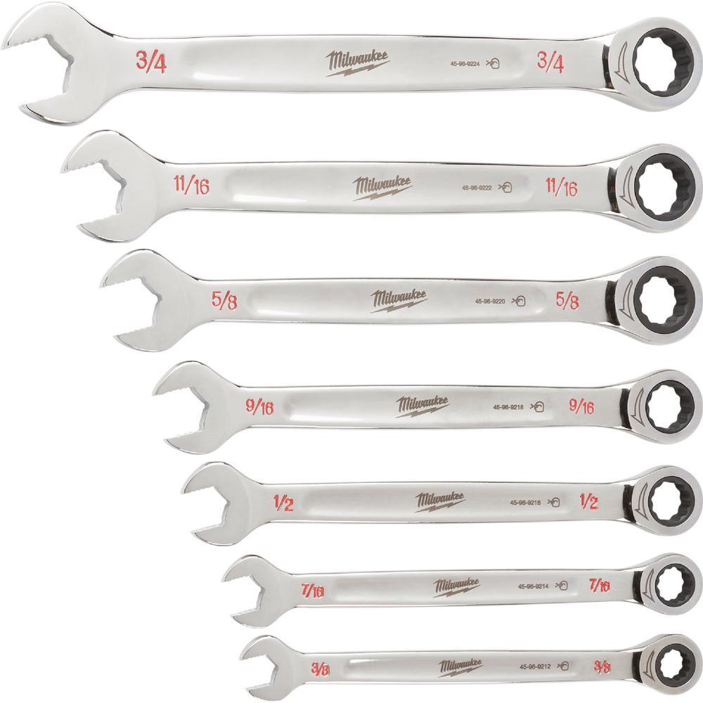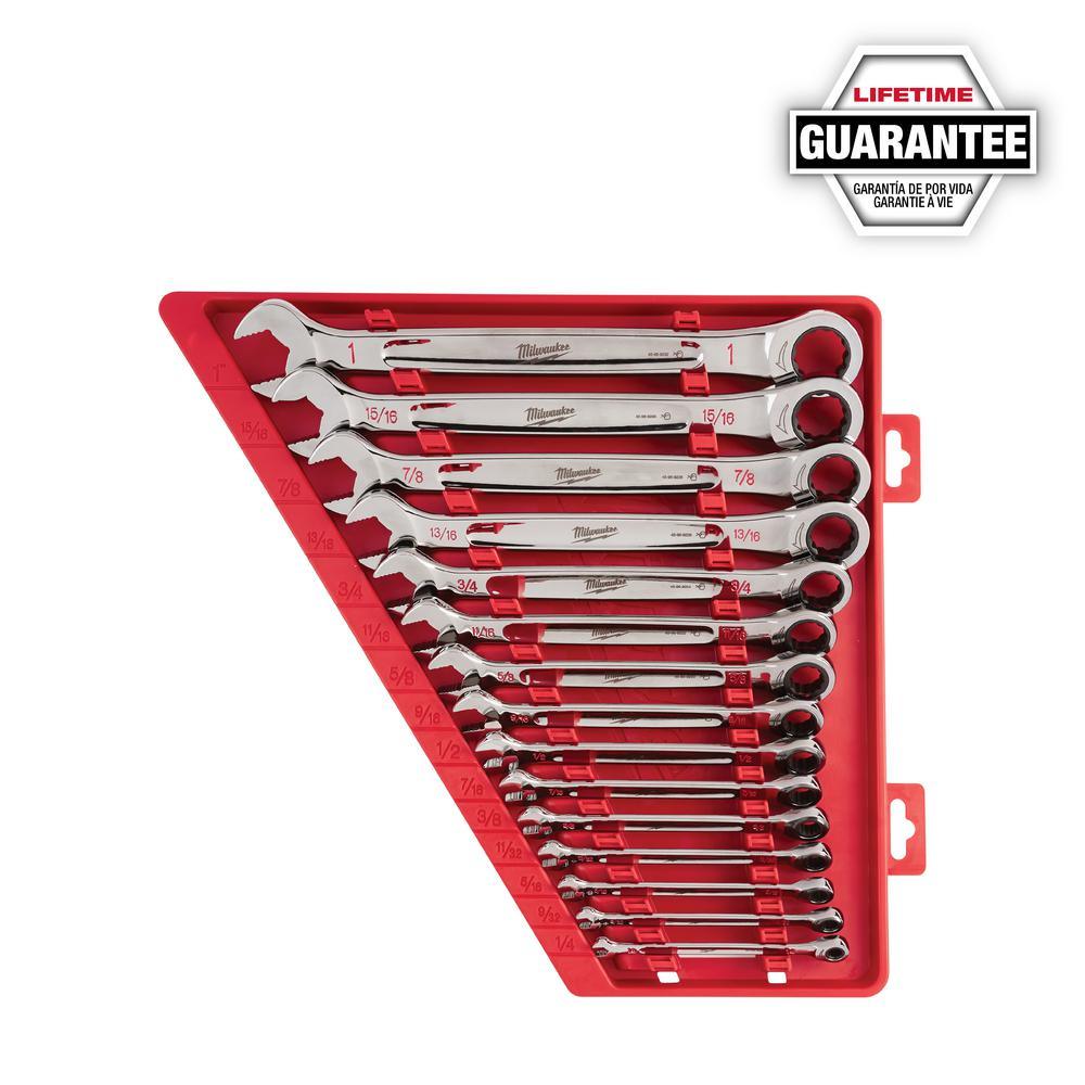 The MILWAUKEE Ratcheting Combination Wrenches feature 2.5 degrees of arc swing, allowing quick and efficient work in tight spaces. These mechanic's wrenches feature durable double-stacked pawls in the ratcheting mechanism, offering the longest ratchet life and improved access with 144 ratcheting positions. MAX BITE Open-End Grip improves the ratchet wrench's grip on nuts and bolts, offering 25% more torque than smooth-faced wrenches. Each combination wrench features an ergonomic I-Beam handle design for improved comfort. The ratcheting combination wrench set features ink-filled size labels for easy size identification, as well as quick distinction between SAE and metric sets. The 15 piece SAE ratcheting combination wrench set comes in a tray designed for steel storage drawers, allowing for efficient storage with no wasted space. These MILWAUKEE combination ratchet wrench sets feature a lifetime guarantee.
