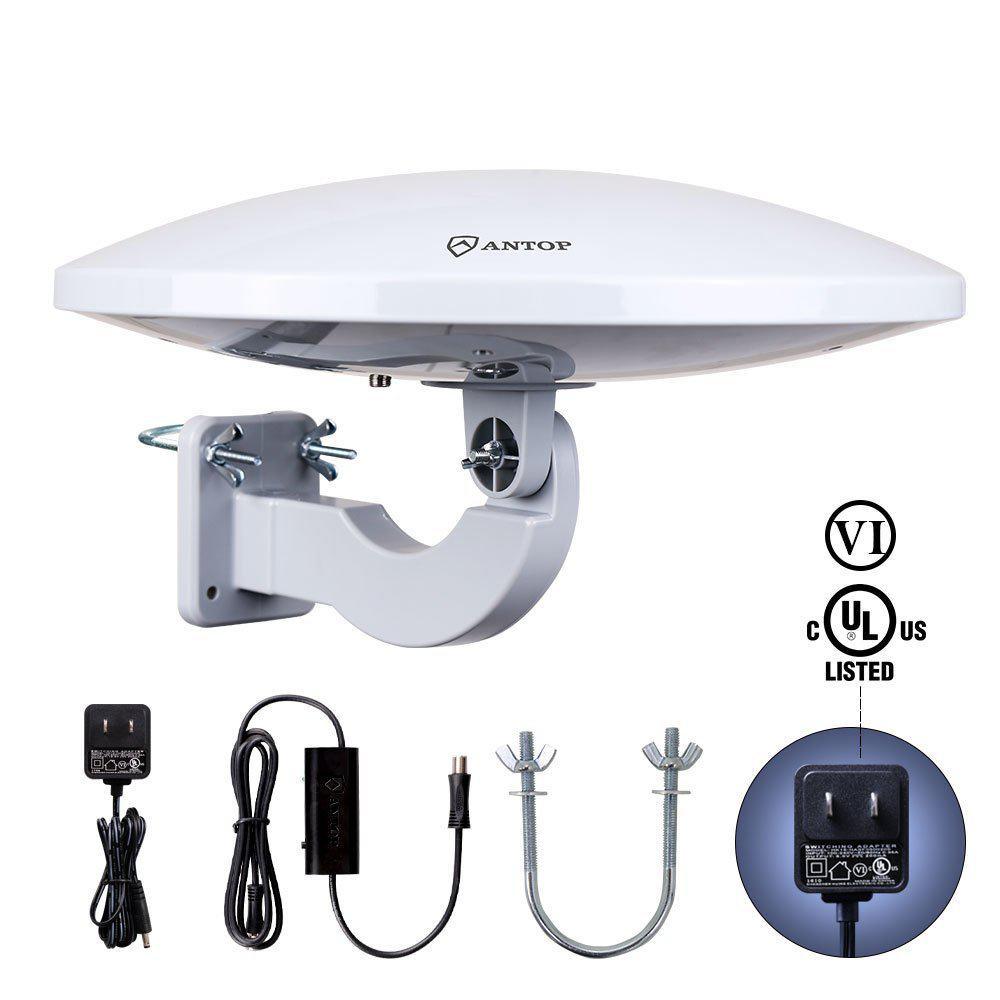 Cut the cord and watch Free local TV with the professional grade PL-414BG UFO Outdoor HDTV Smartpass Amplified Antenna from ANTOP. The PL-414BG HDTV Antenna with new generation digital technology is designed to match similar gain of traditional bulky, unsightly mechanical antennas. It features a Smartpass Amplified 65-mile diameter signal reception range and an Omni-directional reception pattern to receive free local Over-the-Air digital TV signals, from networks such as ABC, CBS, NBC, PBS, Fox, Univision and others. The Smartpass Amplifier, an exclusive ANTOP technology, uses an all-in-one design allowing easier connection while delivering the correct balance between short and long range reception. Also included is a 4G LTE Filter to block out unwanted 3G and 4G wireless signals. The 414BG UFOs design, 15-inch diameter in size, is aesthetically pleasing and suitable to match a wide range of home exterior styles. Its UV coating, weather resistant finish and creative design make the 414BG perfect for home exterior installation: wall, roof and balcony. The UFOs compact size (15 in. Dia) allows you to position the antenna in an attic and is also suitable for RV usage. The 414BG supports HDTV, 1080P TV and 4K ULTRA HD and is compatible with TV converter boxes or digital TVs. ANTOP, an antenna industry leader since 1980, offers a full line of outdoor and indoor digital HDTV antennas.