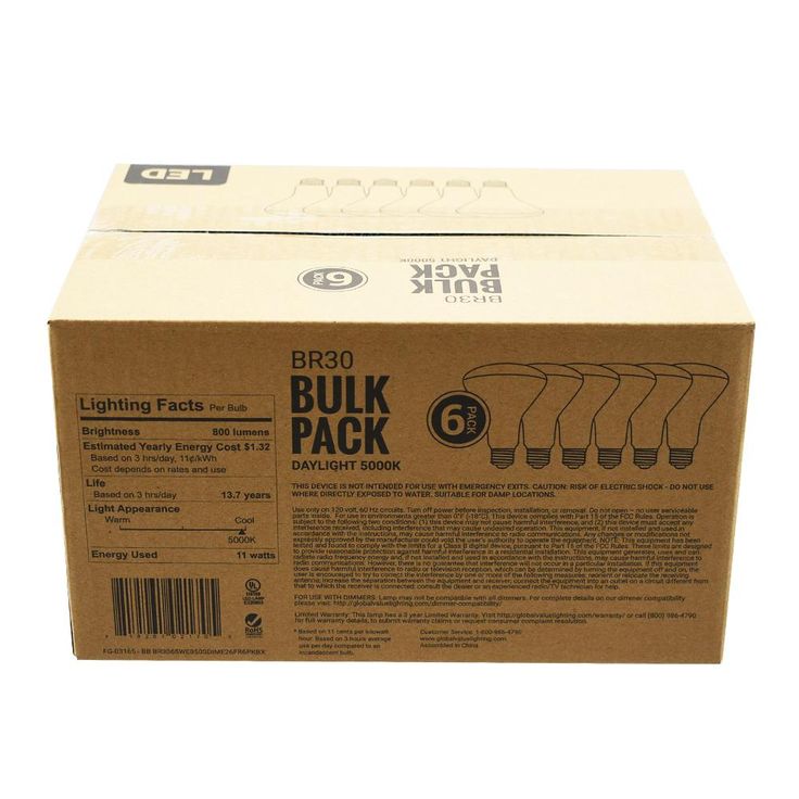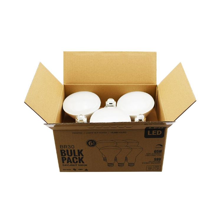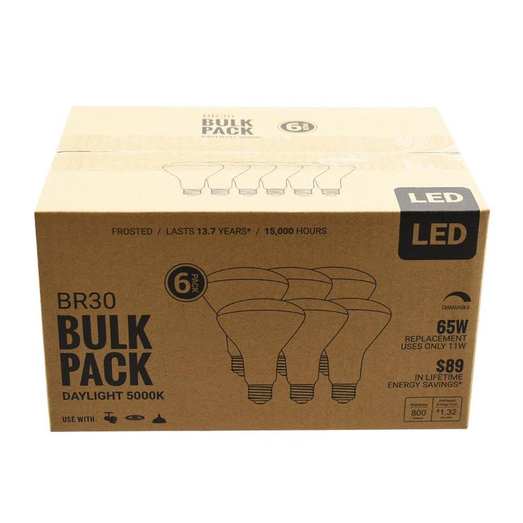 This 6-pack of 65-Watt equivalent Bulk Pack BR30 Downlights medium (E26) base LED light bulb is an energy efficient replacement for traditional incandescent bulbs - with all the benefits of LED technology. The color temperature of this light bulb is Daylight (5000K). These LED light bulbs are dimmable and provide an even distribution of light. The Bulk Pack 65-Watt equivalent LED light bulb uses only 11-Watt of energy - that is an 83% savings over traditional lighting - and that means savings on your energy bill every month. The 15,000-hour lifespan and 3-year warranty makes these light bulbs a great choice for applications in your home and office. Start saving today.