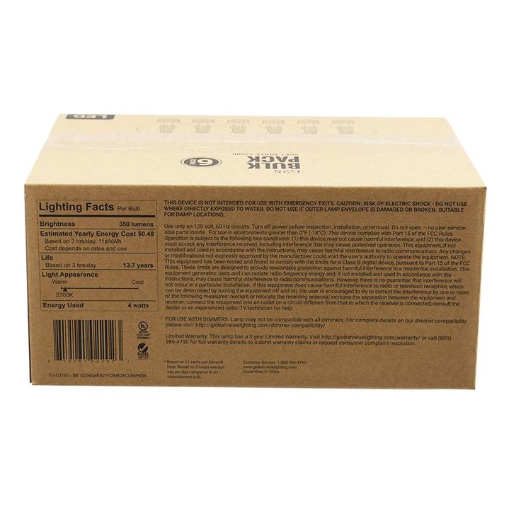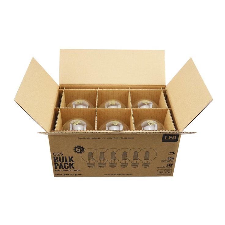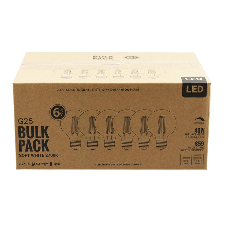 This 6-pack of 40-Watt equivalent Bulk Pack G25 globe medium (E26) base filament LED light bulb is a stylish replacement for traditional incandescent bulbs - with all the benefits of LED technology. The color temperature of this light bulb is Soft White (2700K). These LED light bulbs are dimmable, have a Clear all-glass exterior and provide an Omni-directional (360) distribution of light. The Bulk Pack 40-Watt equivalent decorative LED filament light bulb uses only 4-Watt of energy - that is a 90% savings over traditional lighting - and that means savings on your energy bill every month. The 15,000-hour lifespan and 3-year warranty makes these light bulbs a great choice for applications in your home and office. Start saving today.