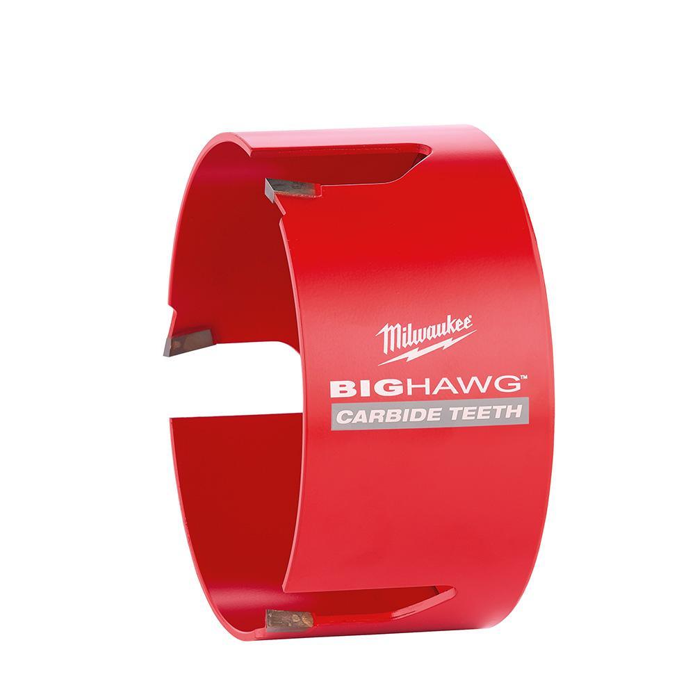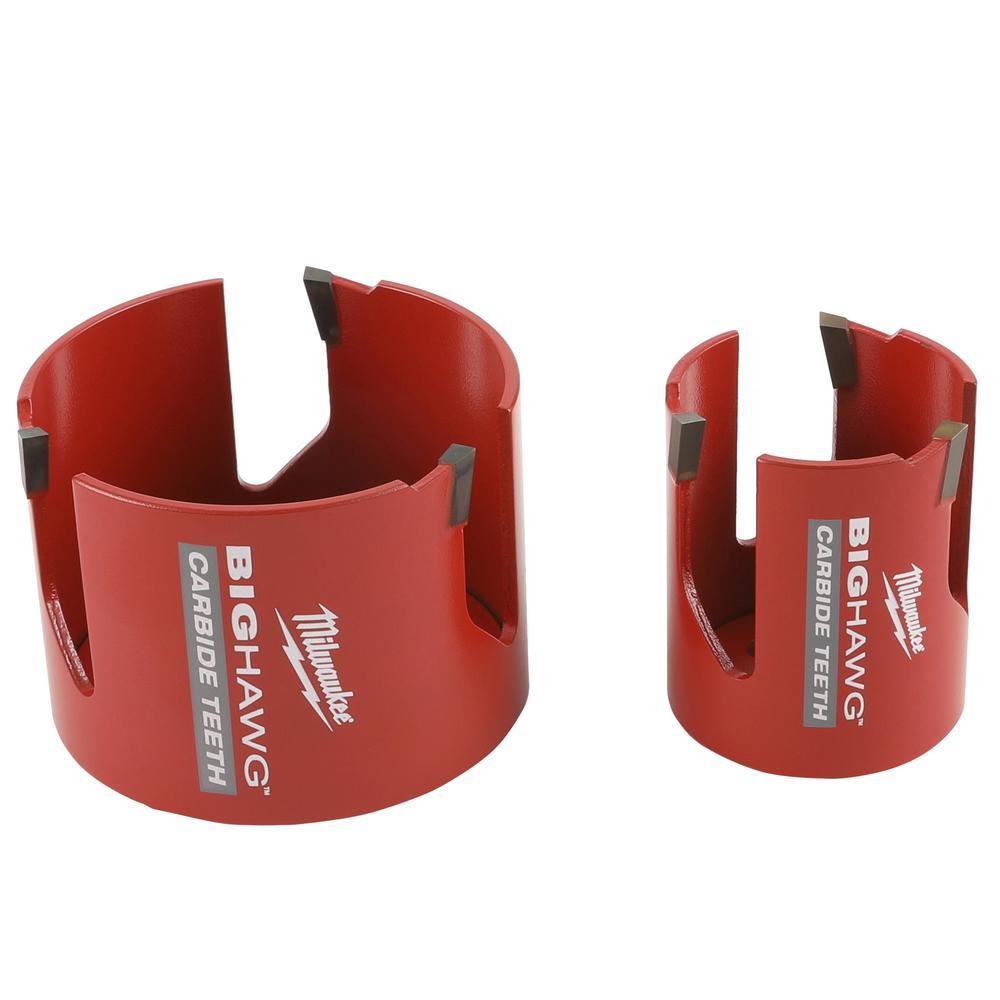 The MILWAUKEE BIG HAWG with Carbide Teeth is the best hole saw solution for nail-embedded wood and abrasive material applications. This first-to-market hole saw offers extreme life utilizing advanced carbide technology. The BIG HAWG gives users 50X more life in demanding applications with the ability to cut 1000+ more nails. The heavy duty hole saw has 10X larger carbide teeth that rip through materials five times faster. Deeper slots allow for fast and easy plug removal. The BIG HAWG hole saw is the best solution for cutting through the toughest materials, including nails, cement board, shingles, plaster and stucco. The kit includes six BIG HAWG hole saws, two pilot bits, an arbor and a diamond file.