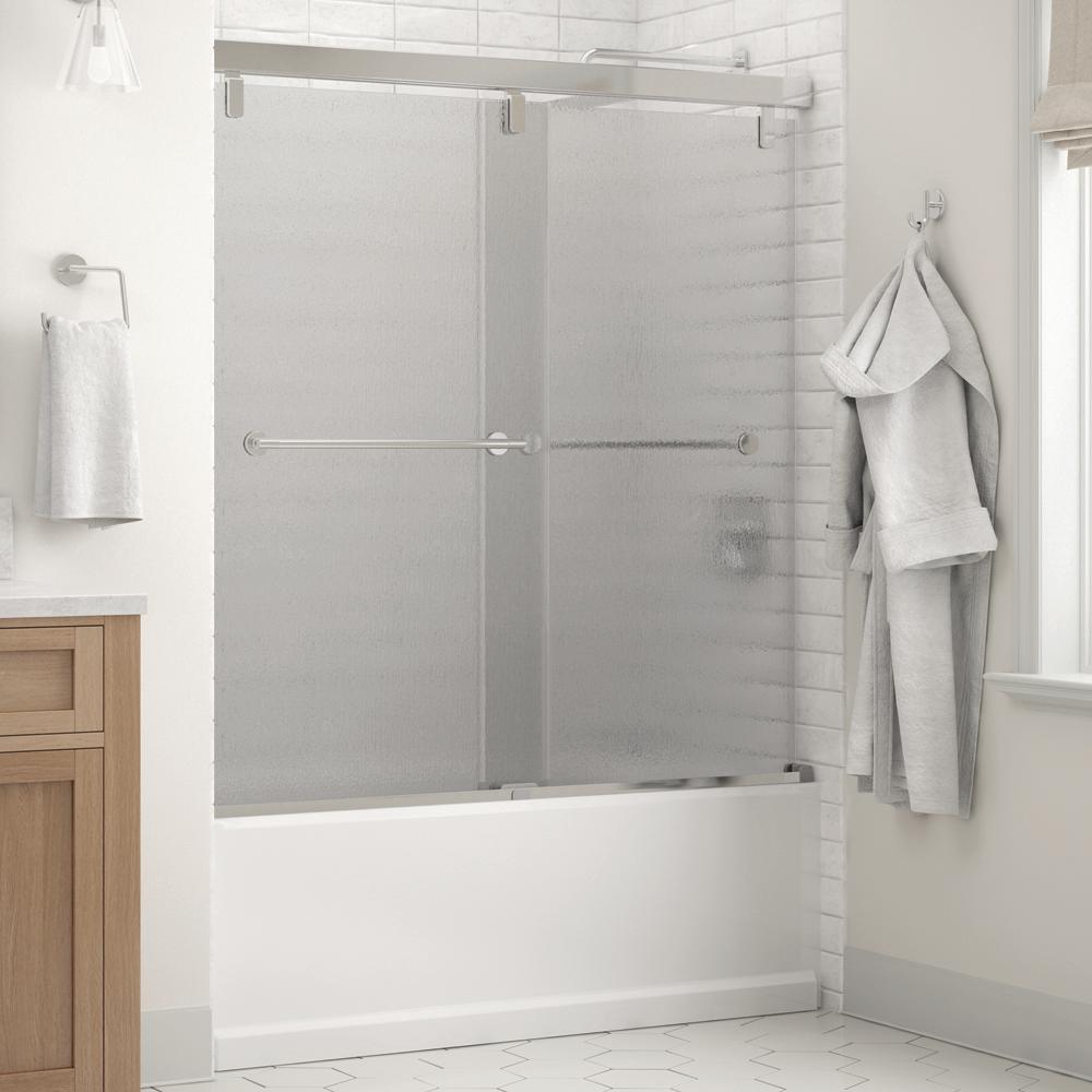 Whether you’re looking for a moderate DIY project or working on a bathroom remodel, upgrading your bathroom with a new sliding shower door is easy with the Delta 1-2-3 custom sliding shower door program. Delta’s custom glass shower door program offers 1000s of design combinations by choosing your glass shower panels, shower door track, and shower door handles to build a unique, personalized glass shower door. Clean, sleek and modern, the Mod bathtub door track in bronze features a soft close system paired with a reversible flat track, and minimal metal components, for the perfect balance of form and function. Make a statement with standard 1/4 in. ANSI certified tempered glass shower panels, featuring a textured surface that resembles water running down the panels for a spa-like feel and the most privacy. The Everly sliding shower door handles in bronze feature two convenient towel bars for extra bathroom storage in a transitional design silhouette that beautifully combines contemporary and classic qualities.