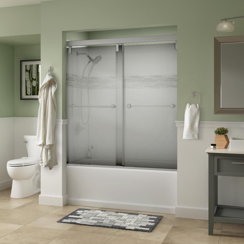 Whether you’re looking for a moderate DIY project or working on a bathroom remodel, upgrading your bathroom with a new sliding shower door is easy with the Delta 1-2-3 custom sliding shower door program. Delta’s custom glass shower door program offers 1000s of design combinations by choosing your glass shower panels, shower door track, and shower door handles to build a unique, personalized glass shower door. Clean, sleek and modern, the Mod bathtub door track in nickel features a soft close system paired with a reversible flat track, and minimal metal components, for the perfect balance of form and function. Make a statement with standard 1/4 in. ANSI certified tempered glass shower panels, featuring a pattern of clear and frosted cascading dots for a glass shower door with a unique and trendy modern look. The Lyndall sliding shower door handles in nickel feature two convenient towel bars for extra bathroom storage in a contemporary design silhouette that beautifully demonstrates simplistic, modern elegance.