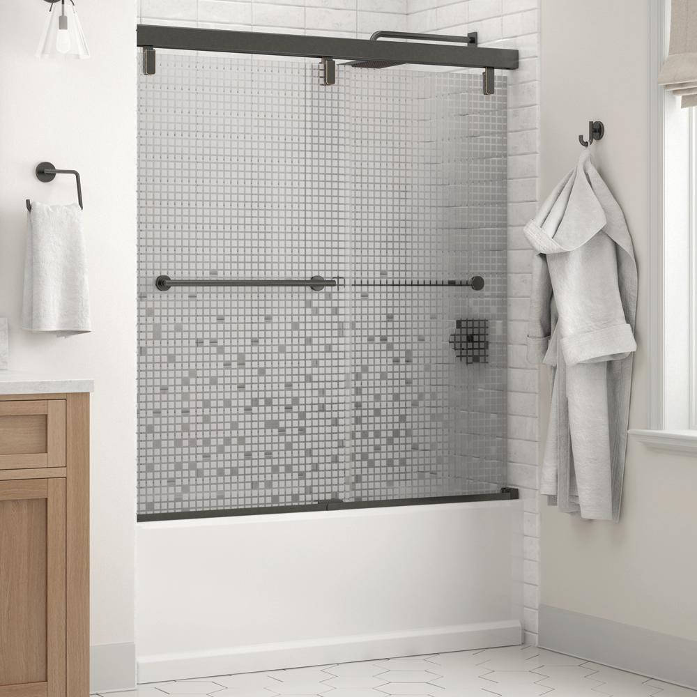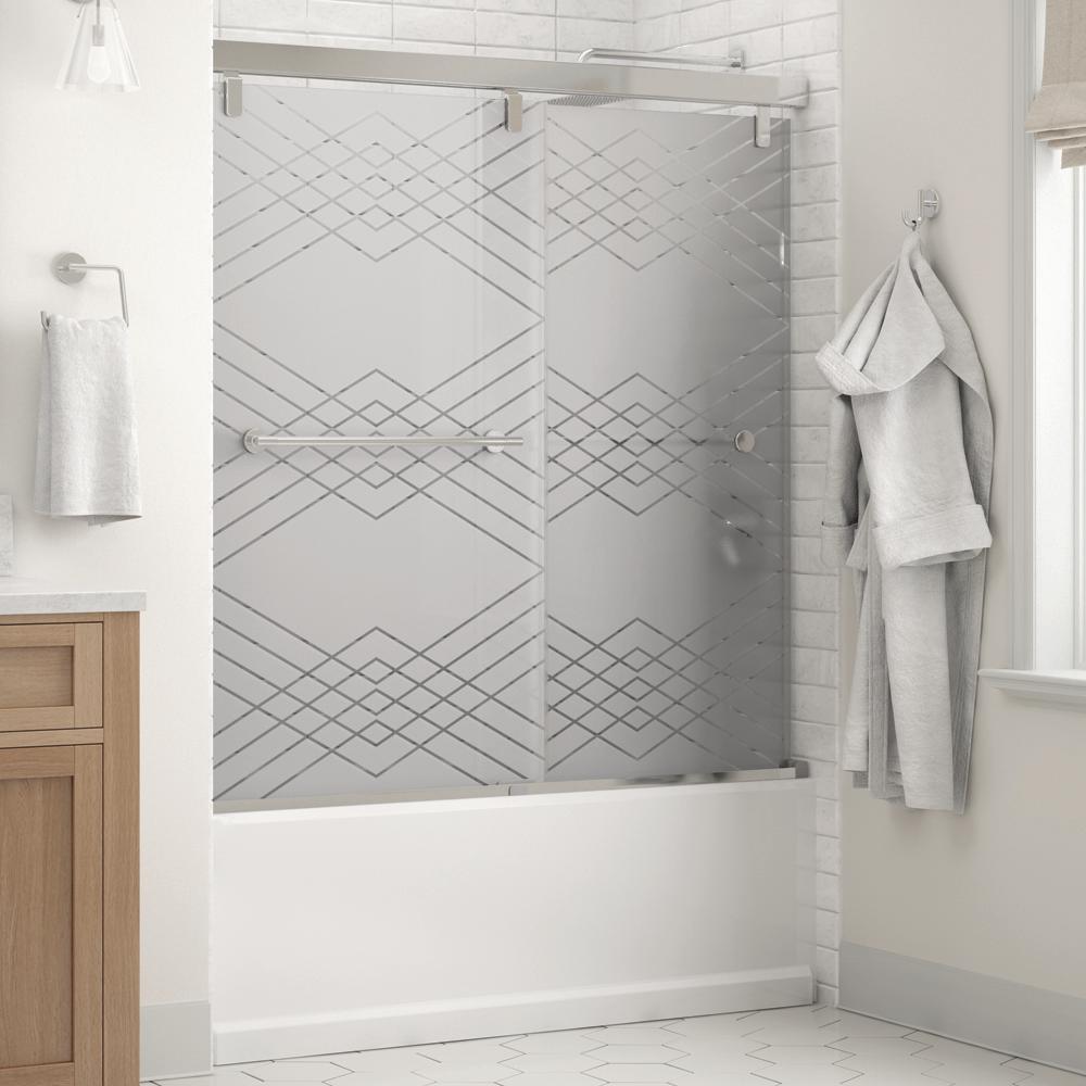Whether you’re looking for a moderate DIY project or working on a bathroom remodel, upgrading your bathroom with a new sliding shower door is easy with the Delta 1-2-3 custom sliding shower door program. Delta’s custom glass shower door program offers 1000s of design combinations by choosing your glass shower panels, shower door track, and shower door handles to build a unique, personalized glass shower door. Clean, sleek and modern, the Mod bathtub door track in nickel features a soft close system paired with a reversible flat track, and minimal metal components, for the perfect balance of form and function. Make a statement with standard 1/4 in. ANSI certified tempered glass shower panels, featuring a smooth and completely frosted glass with a soft, satin-like look that is more private. The Lyndall sliding shower door handles in nickel feature two convenient towel bars for extra bathroom storage in a contemporary design silhouette that beautifully demonstrates simplistic, modern elegance.
