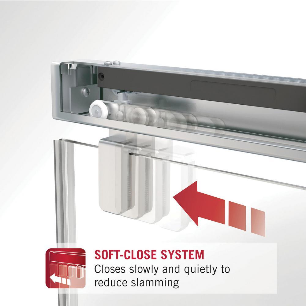 Sleek, modern, reversible top track with semi-hidden rollers and no metal side trim pieces for a more open, frameless, and contemporary look and features a soft close system to eliminate door slams