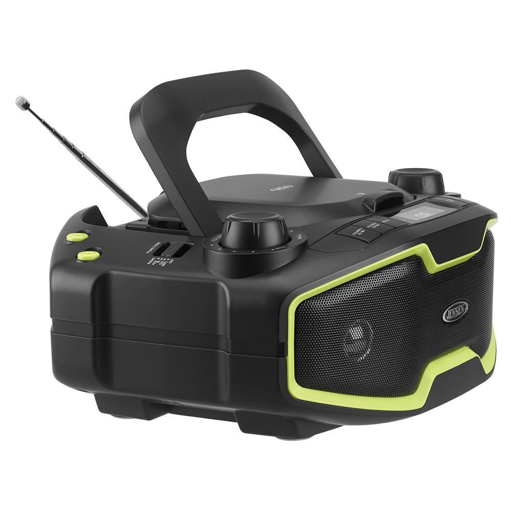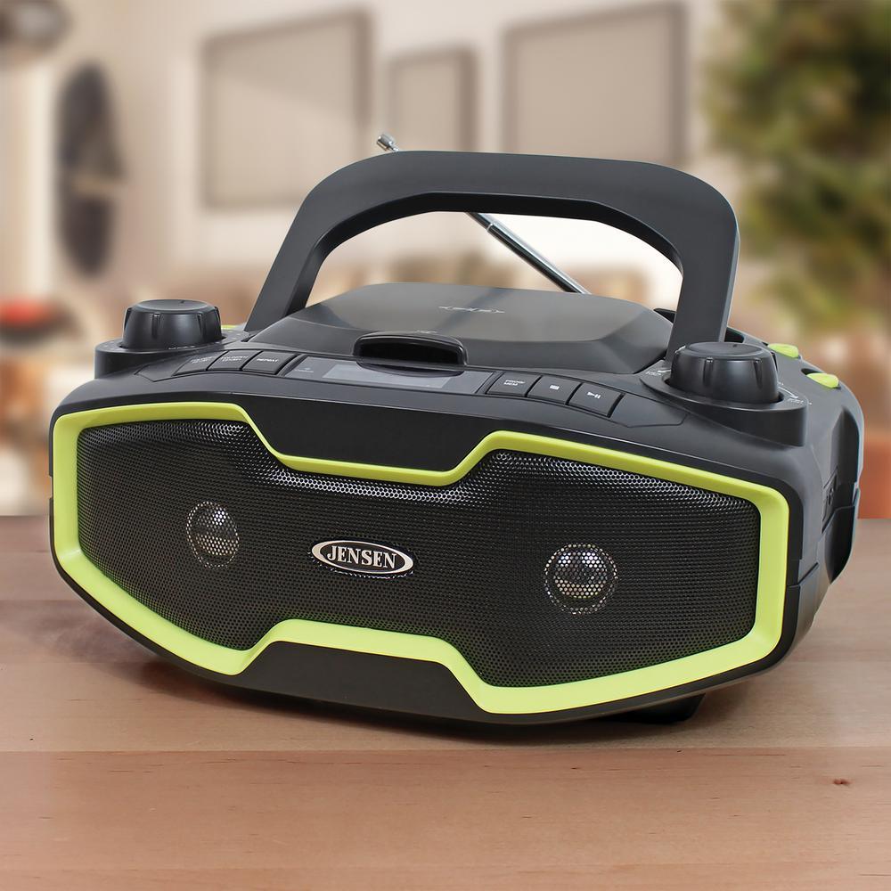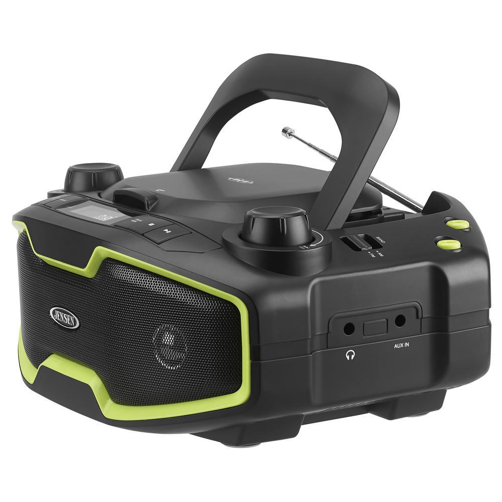 Introducing the JENSEN CD-575 Portable Stereo CD/MP3 player with AM/FM PLL Radio. Take along your favorite tunes with this feature-rich portable AM/FM stereo system. The top-loading CD player provides versatile playback options, and plays both store bought or custom recorded CD-R/CD-RW discs, including those with MP3 music files. This CD-575 has a sleek contemporary design and eye catching green accents. It also includes a built-in handle for easy transport, stereo headphone jack and auxiliary input jack adding to the functionality of the unit. This unit operates on standard 120V AC power or with the built-in rechargeable battery.