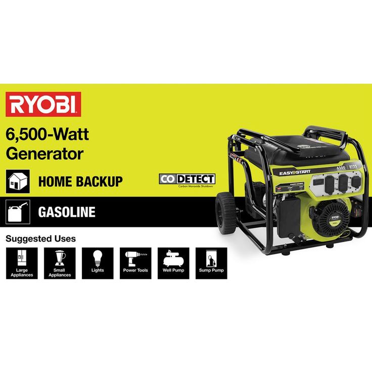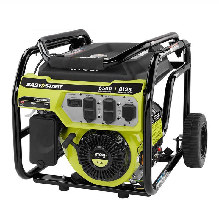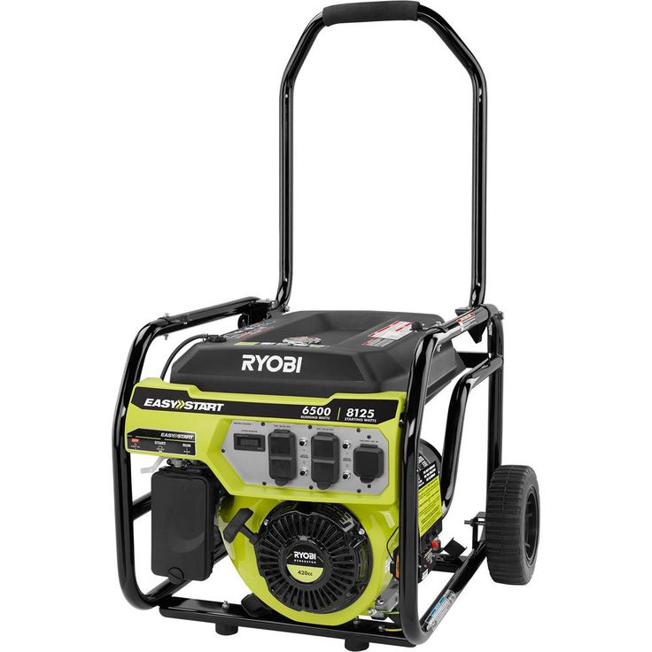 The RYOBI 6,500-Watt Portable Generator is the perfect power solution at home or on the jobsite. This generator delivers 6,500 Running Watts and 8,125 Starting Watts of power. A durable wrap-around hand truck frame and 10 in. wheels help protect the unit while making it easy to transport. An Automatic Voltage Regulator ensures reliable and consistent power while preventing damage to the generator and the devices plugged into it. The easy-access control panel has four 120-Volt 20 Amp (GFCI Protected) outlets and one 240-Volt 30 Amp Twist Lock Outlet to meet all your power needs. All backed by a RYOBI 3-Year Limited Warranty, this RYOBI Portable Generator is guaranteed to perform.