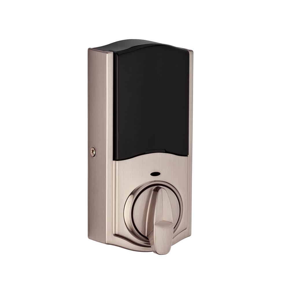 The SmartCode touchpad smart lock with Home Connect technology enables the lock to wirelessly communicate with other devices in home. The lock allows the user (through a web enabled device) to remotely check the door lock status, lock or unlock the door and receive notifications. SmartCode is a 1-touch locking motorized deadbolt. With your personalized code, you can enter your home with the convenience of keyless entry and the back-lit keypad provides increased visibility. SmartCode is easy to install, program and use, and operates on 4 AA batteries. It also features SmartKey Security as the back-up keyway. This single cylinder deadbolt can be locked or unlocked by using the keypad or key from the outside as well as the turn button from the inside. The crisp, clean appearance of the Satin Nickel finish adds to the overall look of the product and brings a modern feel.