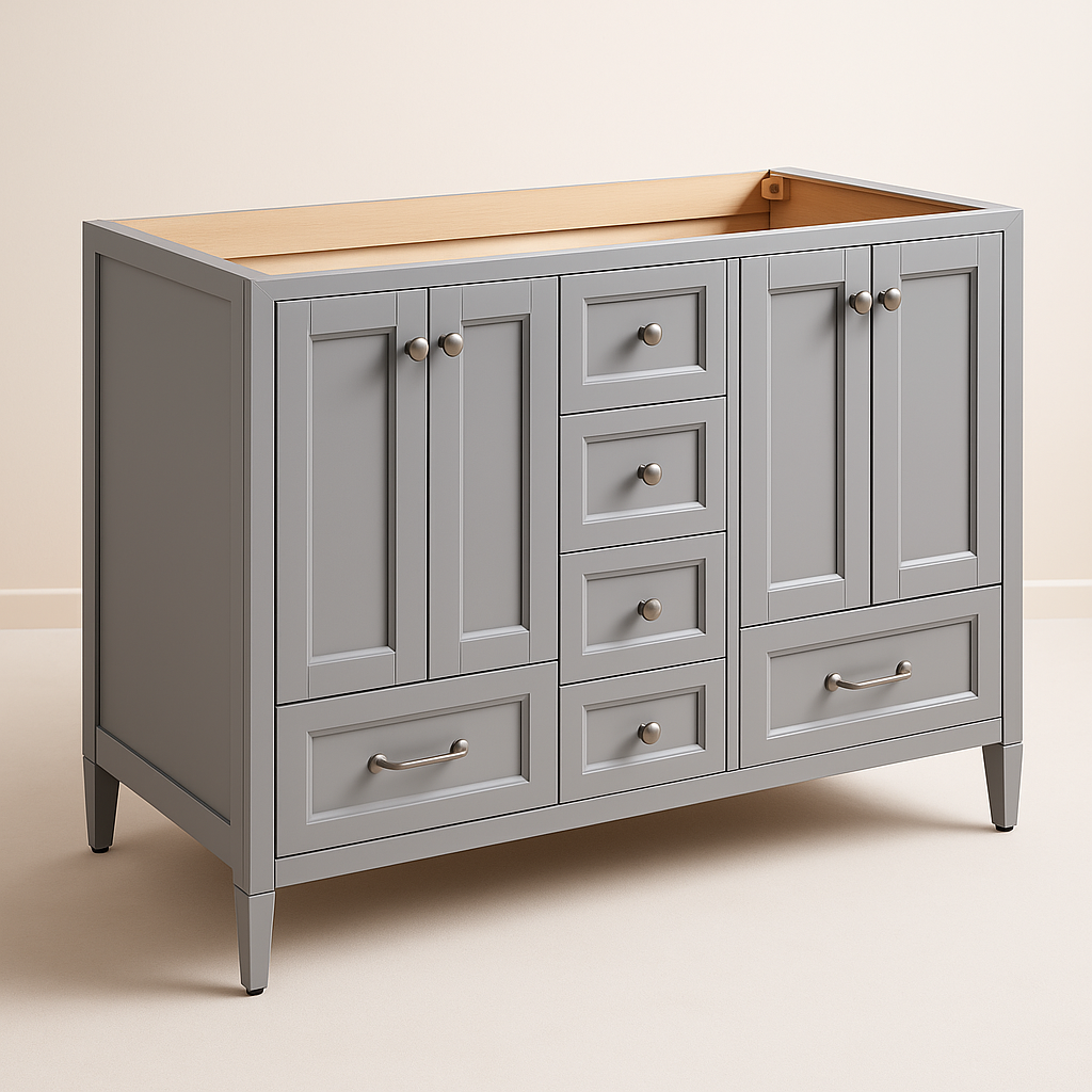 The Claxby 48-Inch Bathroom Vanity Cabinet in Sterling Gray combines elegant design with practical storage solutions, featuring soft-close hinges and durable construction.