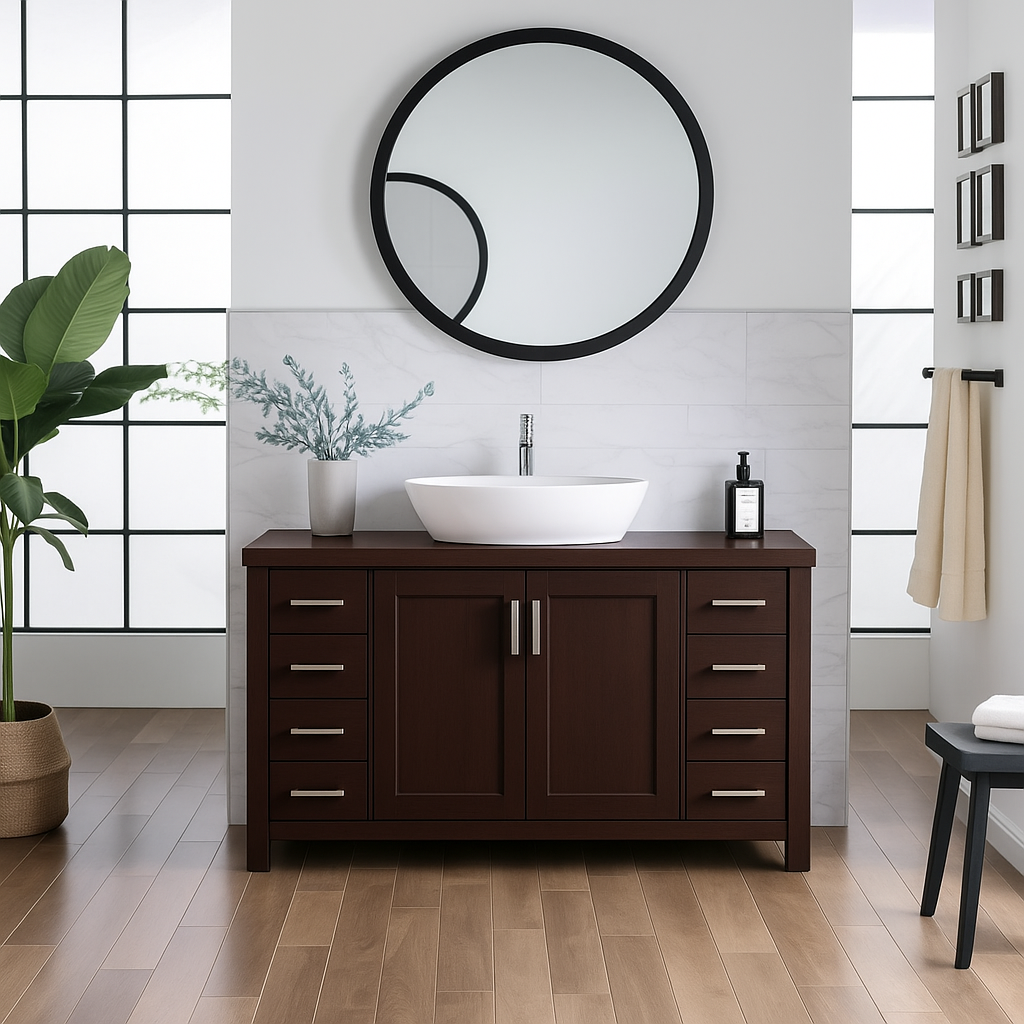 The Westcourt 48-inch vanity cabinet combines modern design with practical storage solutions. Featuring shaker-style doors, flat panel drawers, and a warm chocolate finish, this cabinet is perfect for enhancing any bathroom space.