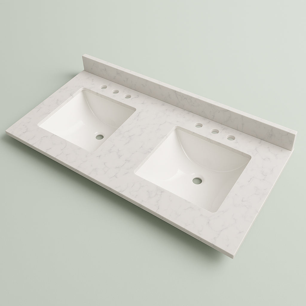 The Home Decorators Collection 61-inch double sink vanity top in Dune combines elegance and functionality. Featuring a durable engineered stone composite with a nonporous surface, it resists stains and bacteria while offering a natural stone look. Perfect for modern bathrooms, it includes two undermount sinks and a matching backsplash for easy installation.