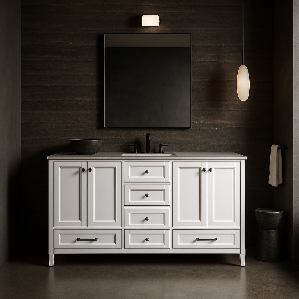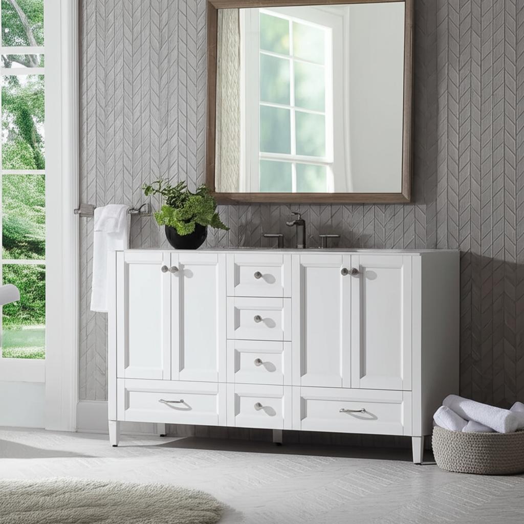 The Claxby 60-Inch Bathroom Vanity Cabinet in White combines elegant design with practical storage solutions. Featuring soft-close hinges, polished nickel hardware, and a durable wood construction, this vanity is perfect for enhancing your bathroom's style and functionality.