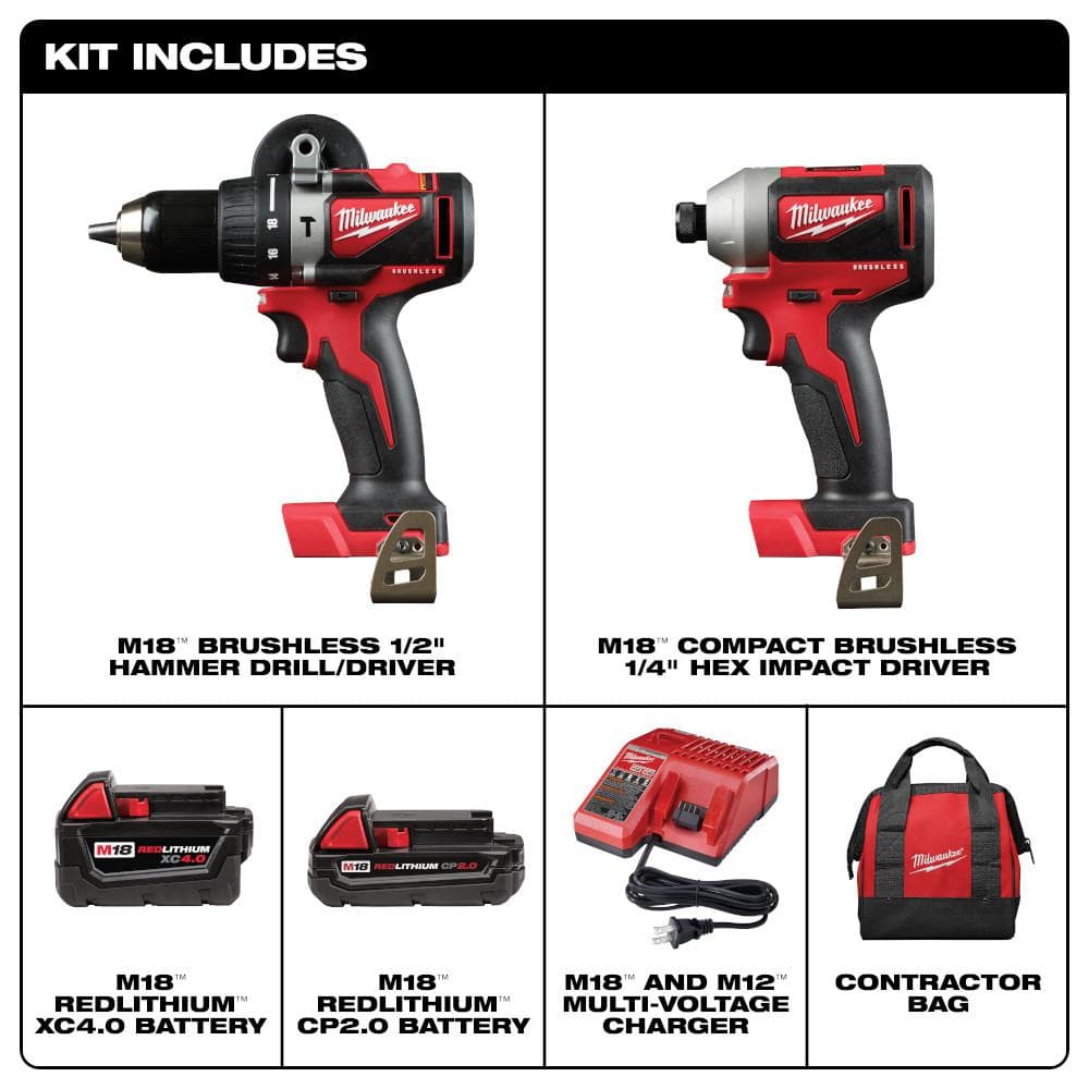 This Milwaukee M18 brushless combo pairs a 1/2 in. hammer drill/driver (2902-20) and a 1/4 in. hex compact impact driver (2850-20) for powerful, efficient performance on the job. REDLINK intelligence and REDLITHIUM batteries deliver more work per charge, while the compact, durable design excels in tight spaces. Includes 2 batteries, multi-voltage charger, belt clip, and contractor bag.