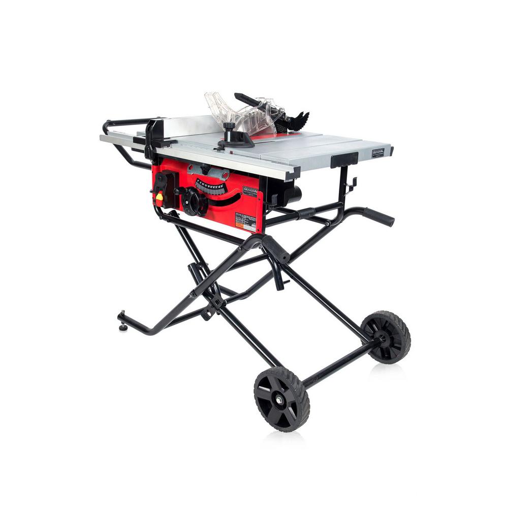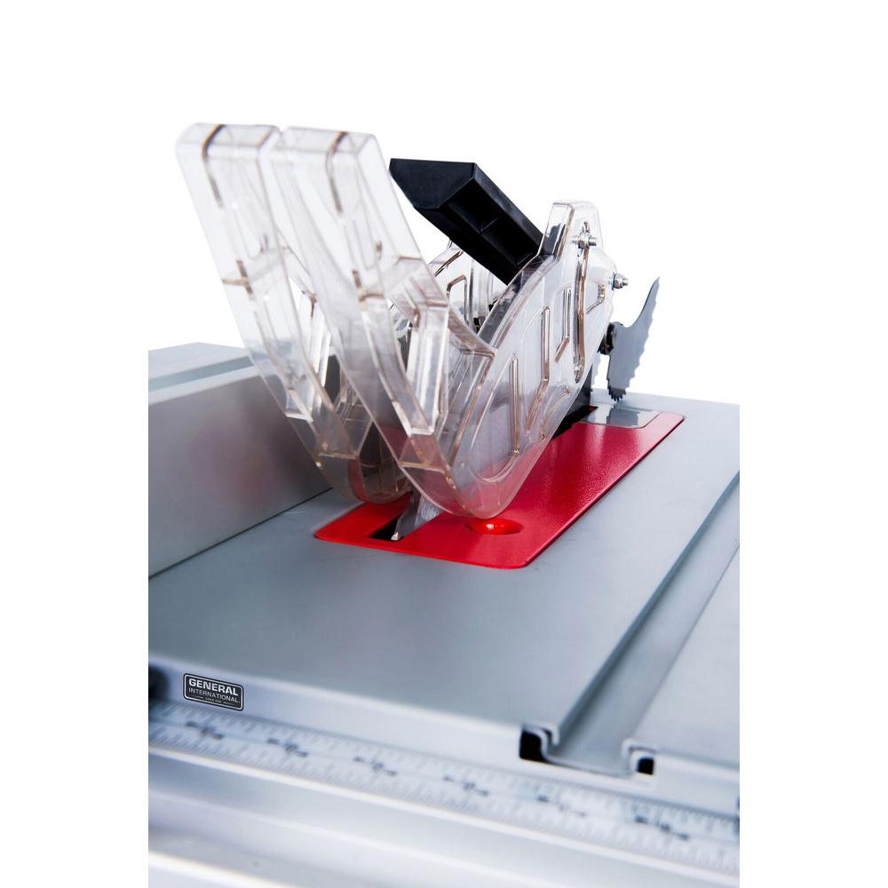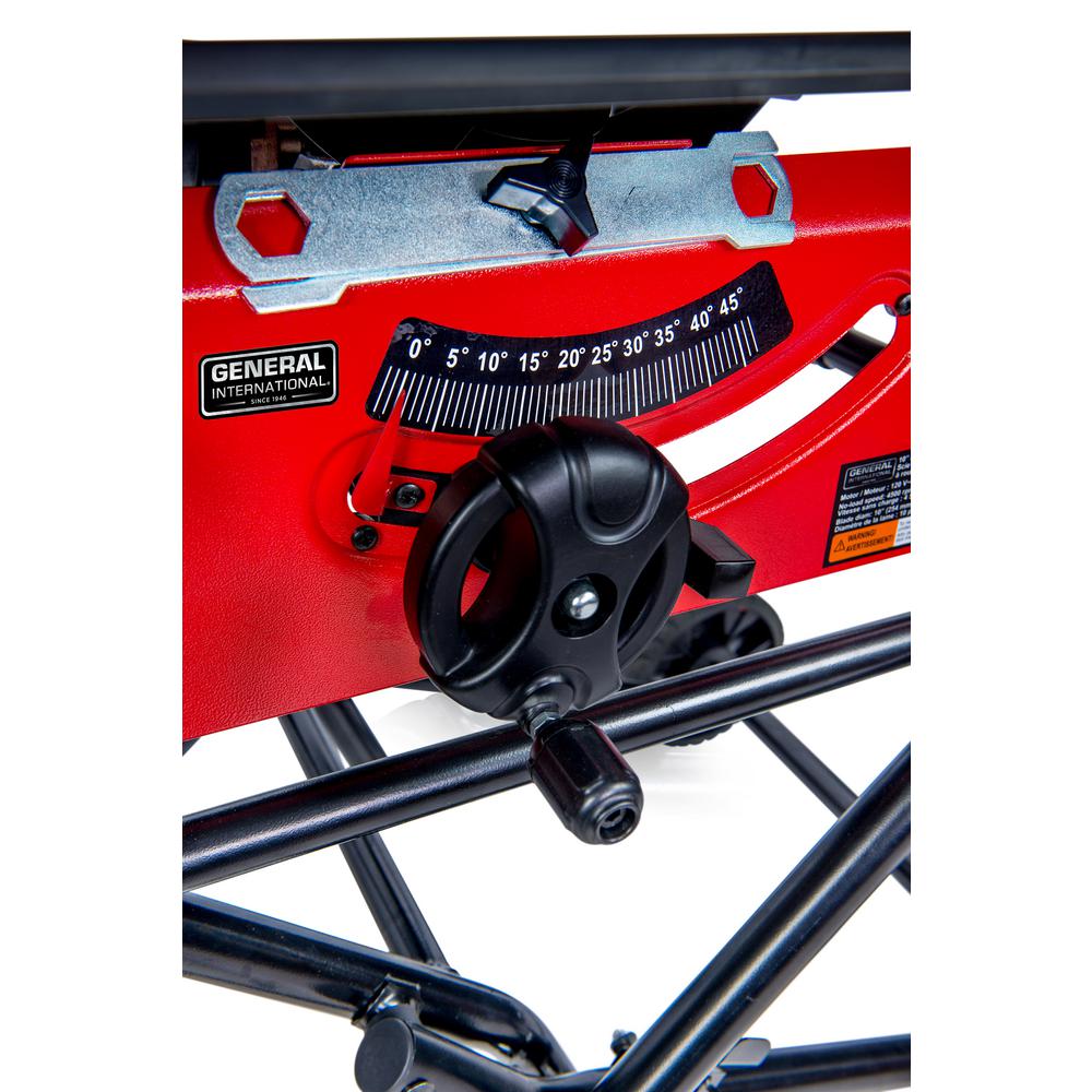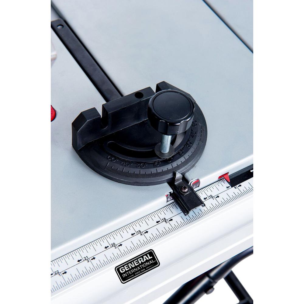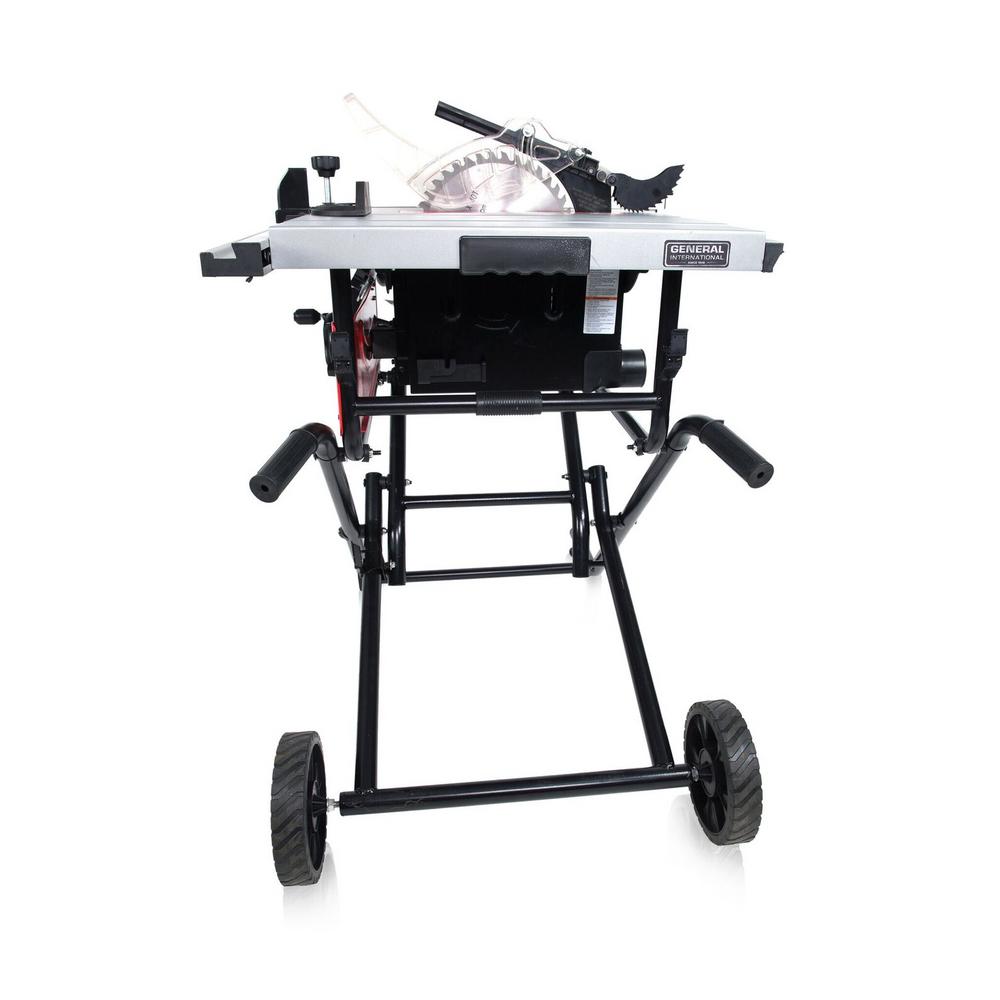 This General International 10 in. 15 Amp 120-Volt commercial portable table saw is perfect for any woodworker, carpenter or hobbyist. It features a 15.0 Amp high-torque motor with the power to cut pressure-treated lumber and hardwoods. It offers 3.33 in. D of cut at 90° and 2.5 in. at 45° for multiple tasks. Its on board storage provides easy access to the components and push stick when not in use. This model features a sturdy aluminum extendable stand with wheels for ease of portability and setup. Includes a 2-year limited warranty.