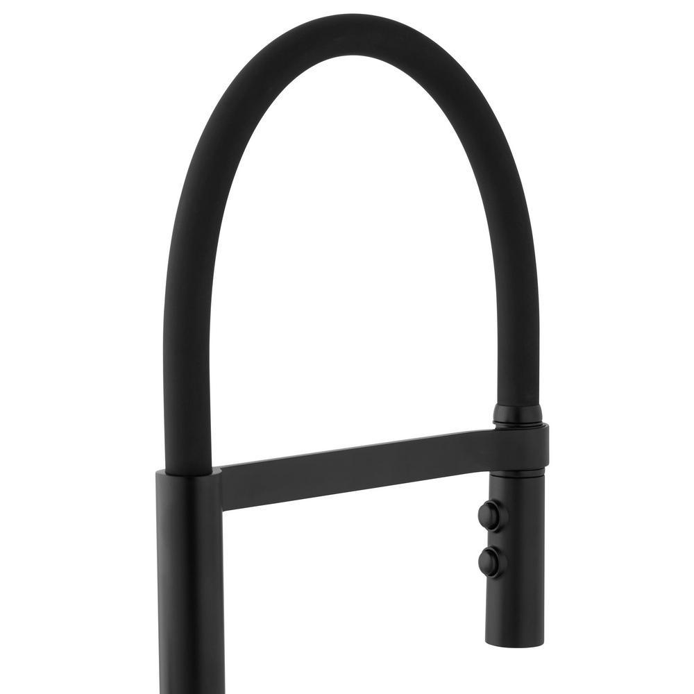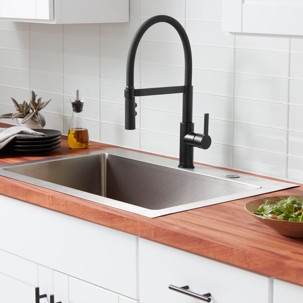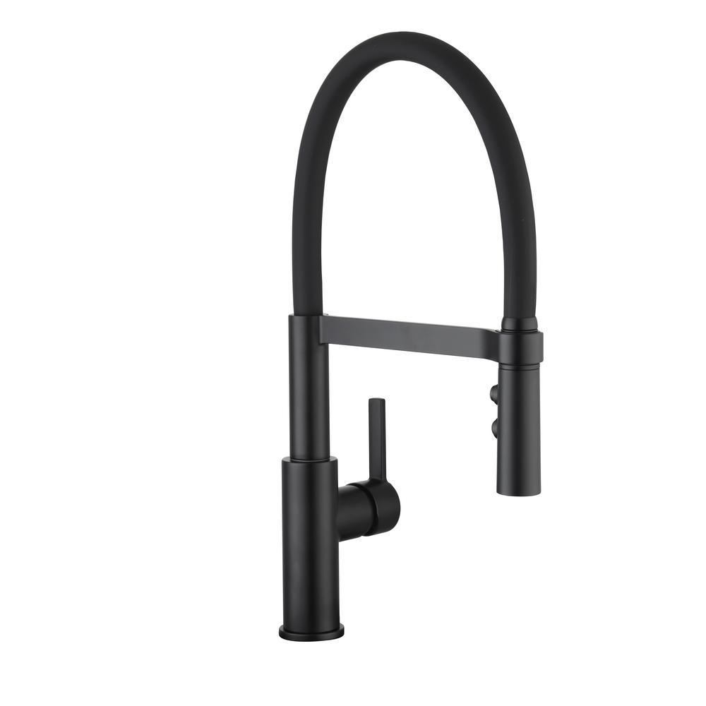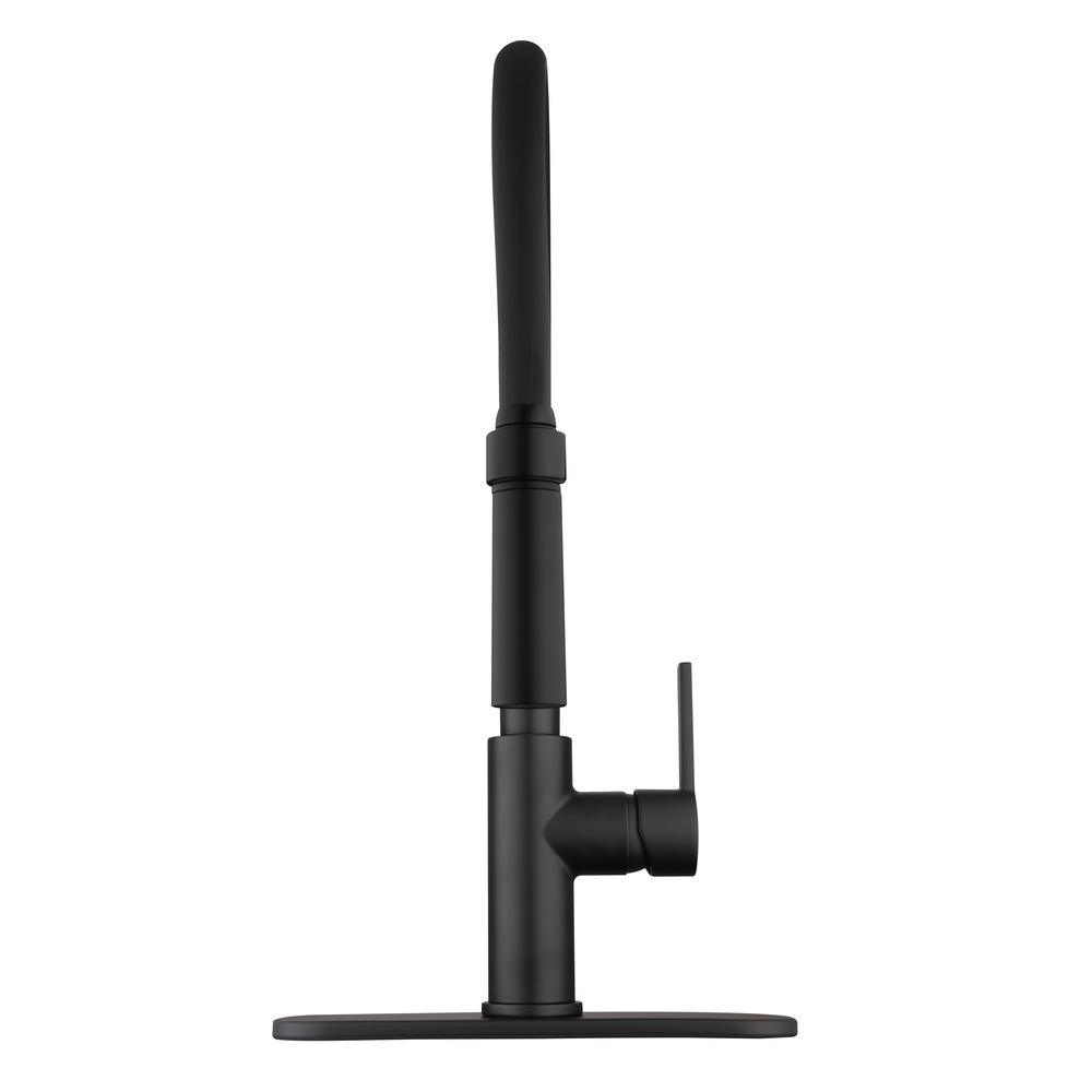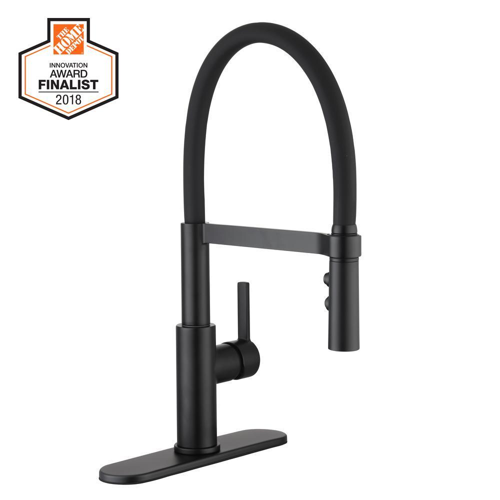 The Glacier Bay Statham Single-Handle Rubber Hose Spring Neck Kitchen Faucet in Matte Black is a stylish modern faucet with unmatched style and functionality. Easy-to-use with a single handle design, this faucet has a convenient spray wand with 2-spray modes. The sprayer features an aerated spray and a new TurboSpray that is exclusive to Glacier Bay. The TurboSpray from Glacier Bay provides a stronger spray pattern than your standard pull-down faucet. Featuring a ceramic disc cartridge for drip free performance and a 1.8 GPM flow rate, this kitchen faucet also includes the exclusive FastMount mounting system to make installation quicker and easier.