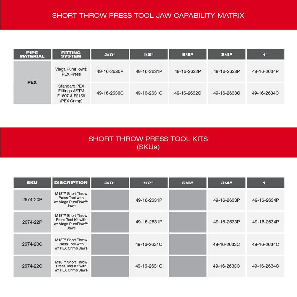 PEX Compatibility: Presses Viega PureFlow fittings 3/8 in.–1 in.; jaws for 1/2 in., 3/4 in., 1 in. included