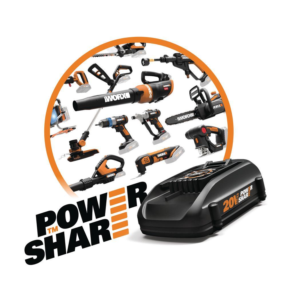Share batteries across all your 20-Volt Worx power share tools so you never run out of power