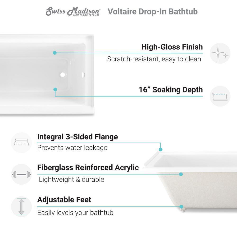 The Voltaire drop-in bathtub offers a beautiful aesthetic that complements any bathroom decor. The high-gloss finish gives it a sleek classic look that is easy to clean and resistant to chipping and cracking. The Voltaire drop-in bathtub is available in multiple lengths for different bath spaces.