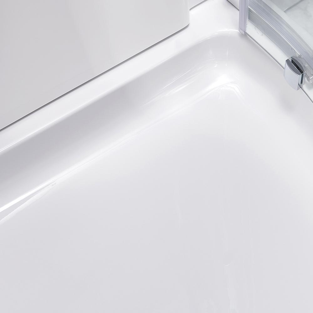 Durable pure white shower walls and base in reinforced acrylic construction with fiberglass resists stains and scratches