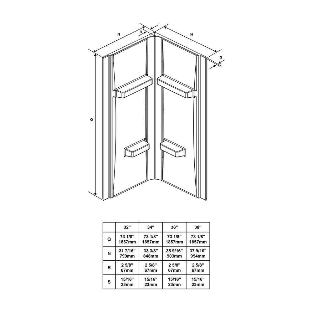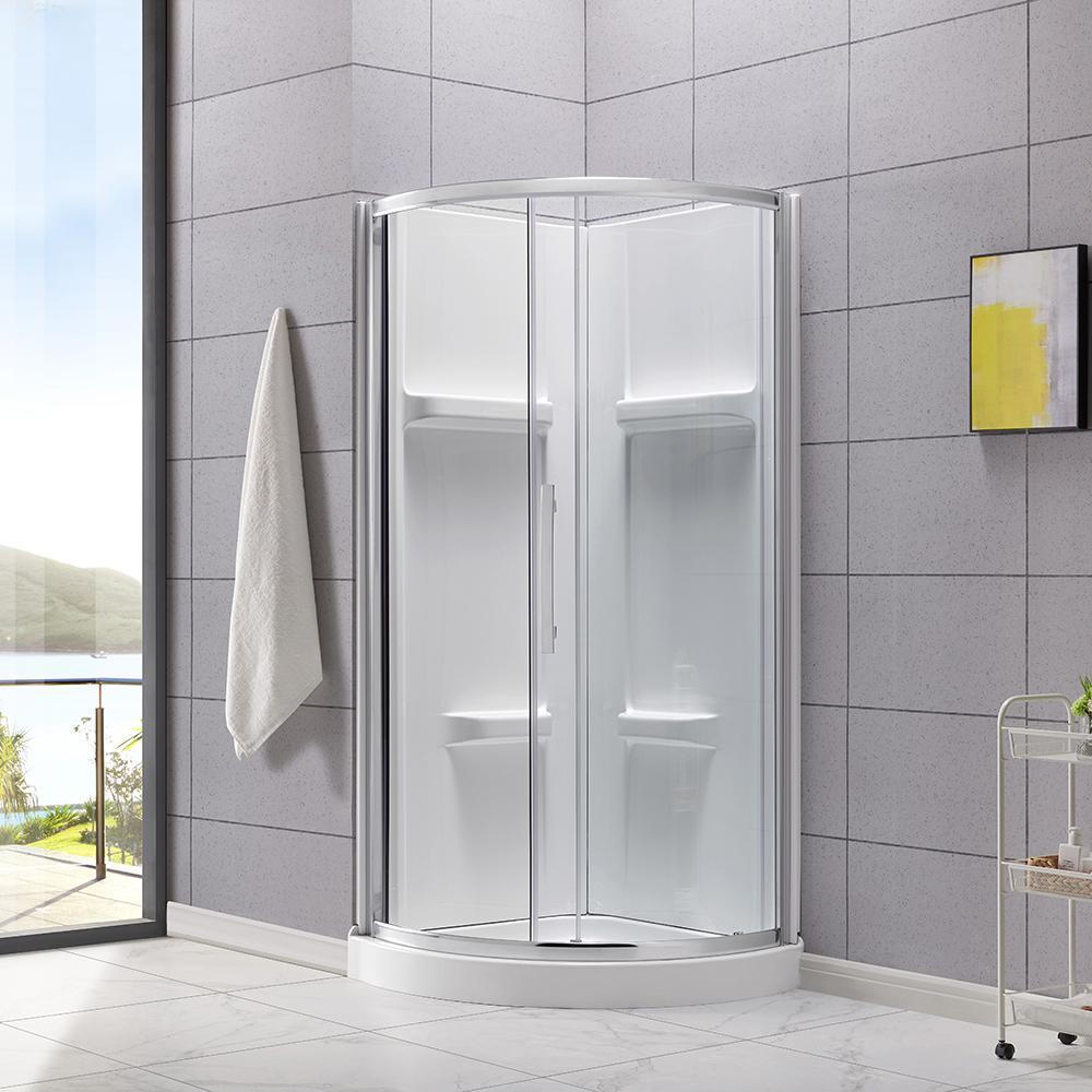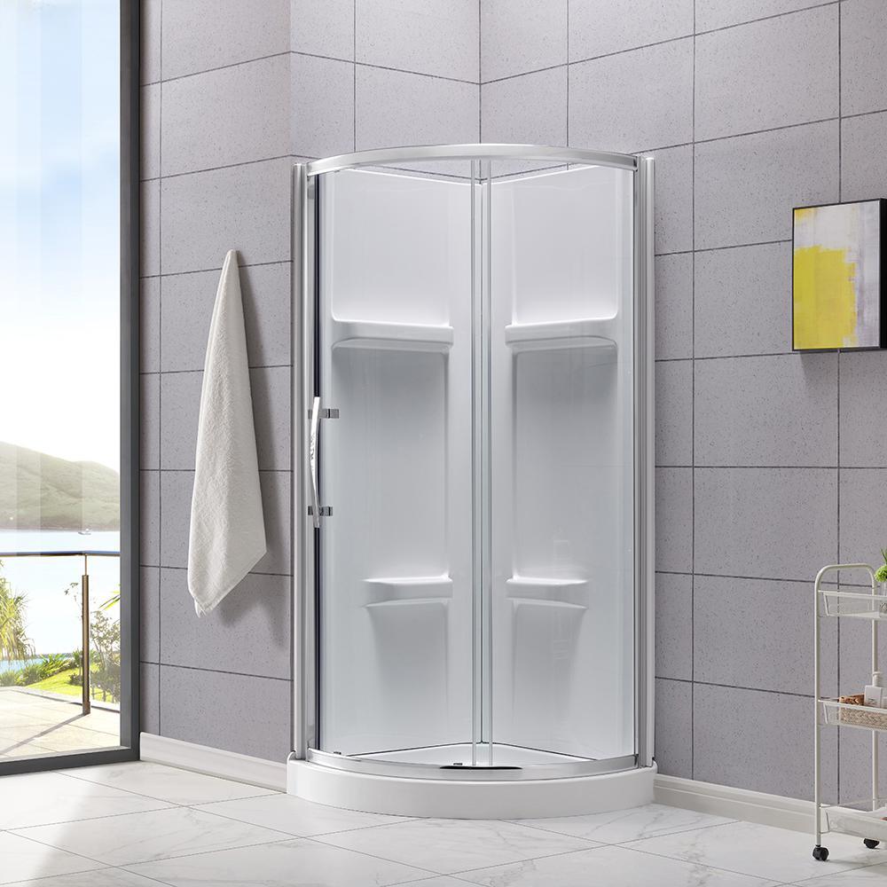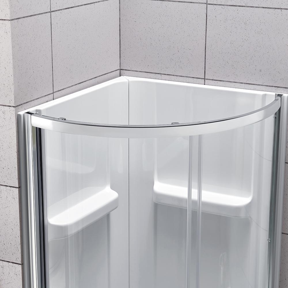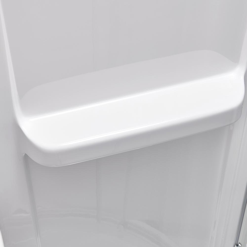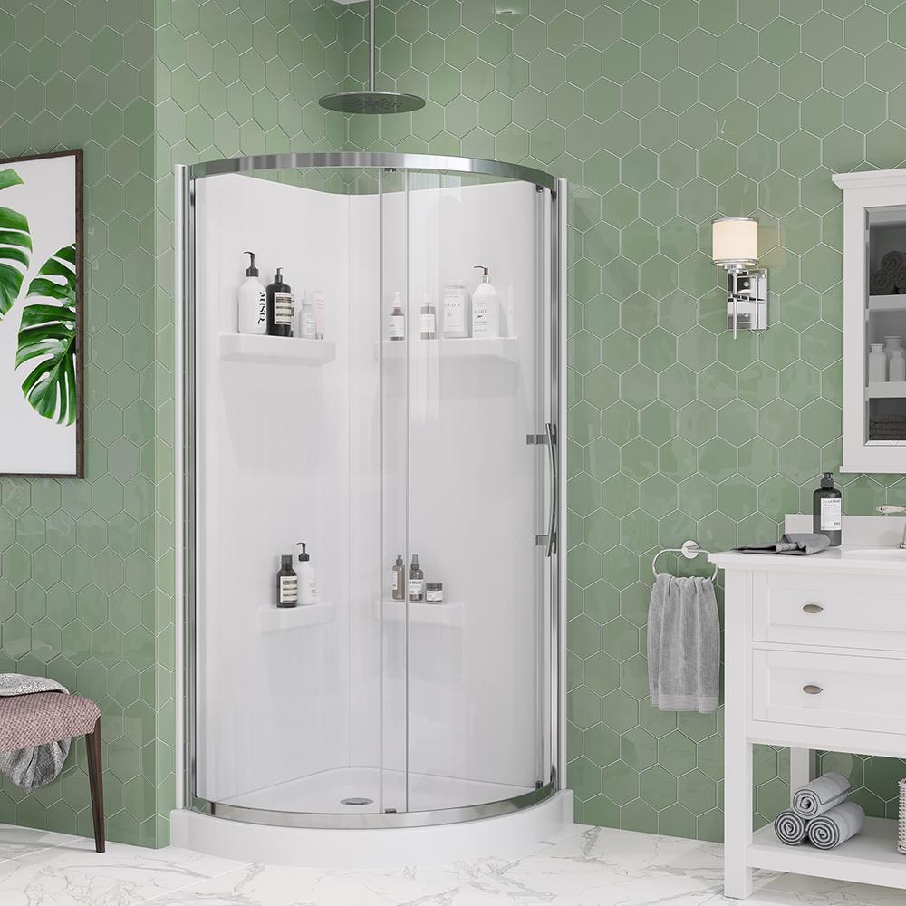 Squeeze extra space out of your bathroom with the Maia 32 in. Corner Drain Corner Shower Kit by Glacier Bay. Four handy shelves, including two extra-deep ledges, are the perfect spot to stash a wide array of shampoos, body washes and more. Clear glass rounded sliding shower doors with chrome trim and a stylish oversized handle open smoothly and silently on premium rolling hardware. Pure white acrylic walls reinforced with fiber glass offer durable scratch and stain resistance, while a low-profile shower base threshold height allows easy access in and out.