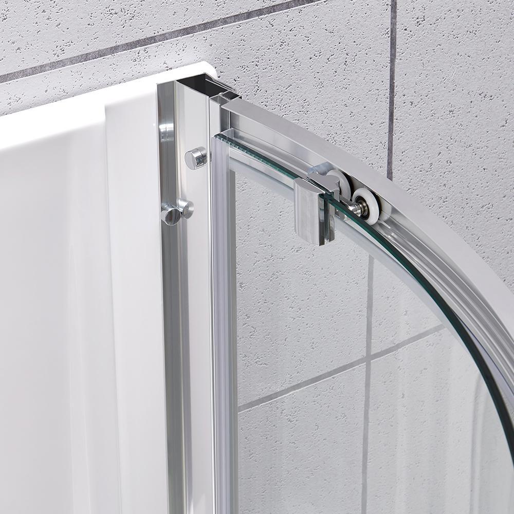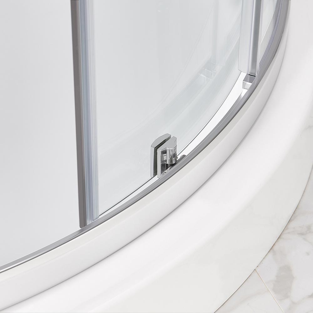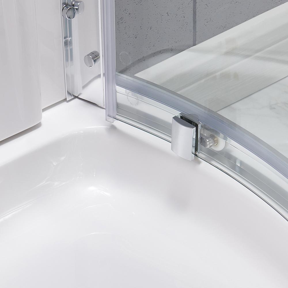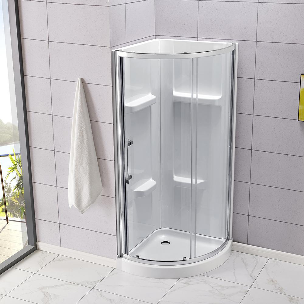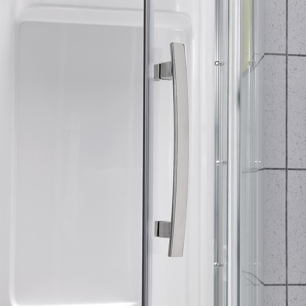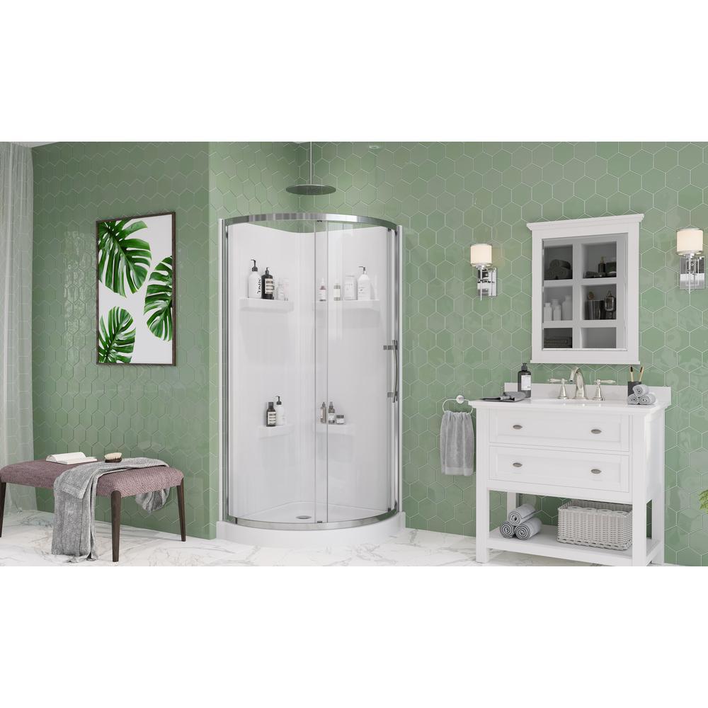 Squeeze extra space out of your bathroom with the Maia 34 in. Corner Drain Corner Shower Kit enclosure by Glacier Bay. Four handy shelves, including two extra-deep ledges, are the perfect spot to stash a wide array of shampoos, body washes and more. Clear glass rounded sliding shower doors with chrome trim and a stylish oversized handle open smoothly and silently on premium rolling hardware. Pure white acrylic walls reinforced with fiber glass offer durable scratch and stain resistance, while a low-profile shower base threshold height allows easy access in and out.