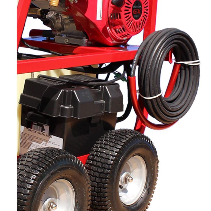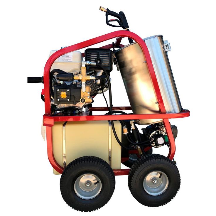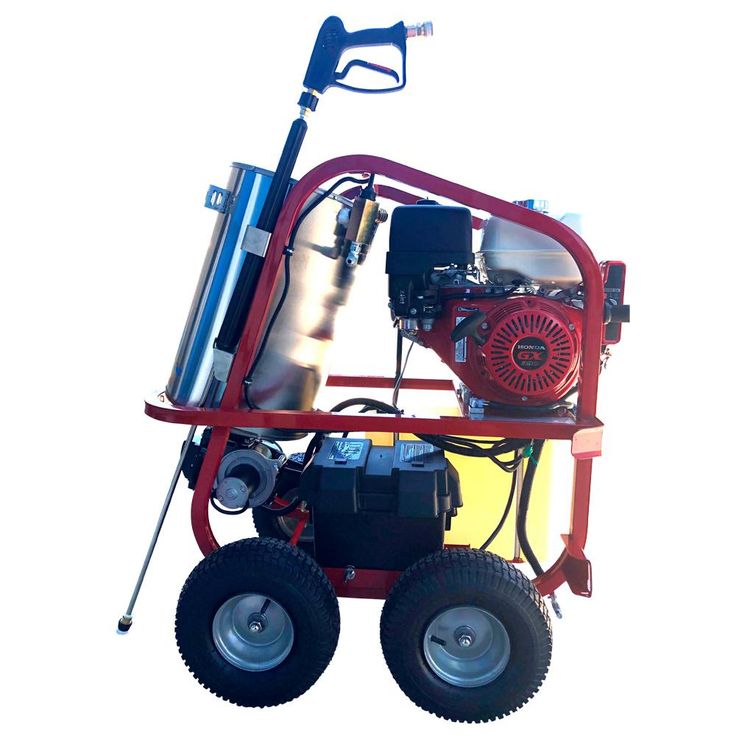 The Dirt Laser SH40004HH is a portable hot water high power washer with a compact design, ideal for use where electric power is not available. An industrial duty Honda engine provides power to the triplex, ceramic plunger, direct-drive AR pump and thermostatically controlled 12-Volt DC burner. The stainless-steel wrapped 1/2 in. SCH 80 steel coil heats water up to 250°F. You will experience extended burner run time with the large 8 Gal. fuel tank. Its rugged powder coated frame has a lifting point, integrated hose hooks, wand holder and 4 large wheels are included for portability.